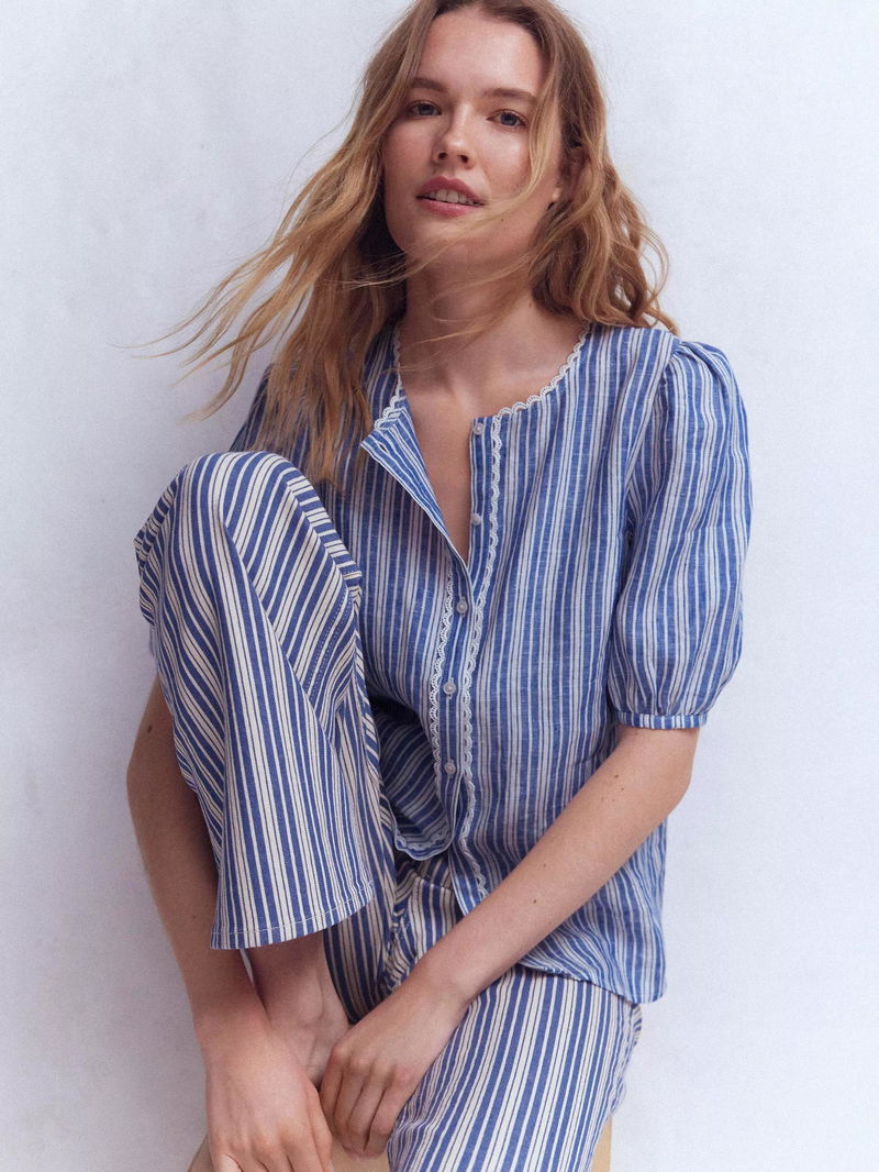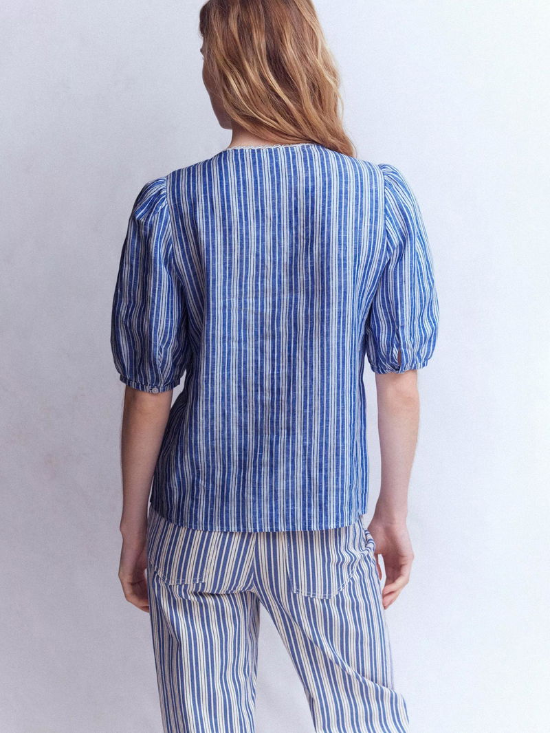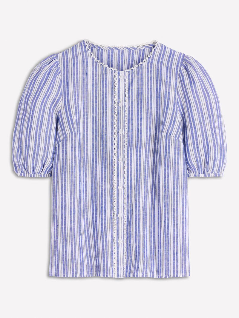 Leah Stripe Pure Linen Top, Bright Blue