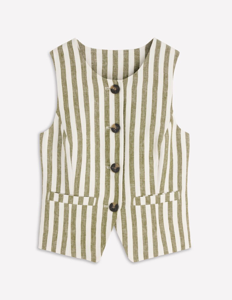 Linen Scoop Neck Waistcoat-Olive, Ivory Stripe