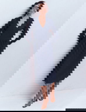 This simple-but-stunning black wrap dress has serious figure-flattering potential. It accentuates your shape with its feminine crossover V-neck and a smoothing ruched waistband that nips you in at all the right places. The soft jersey fabric is rich in light-as-air viscose, with a hint of stretch for a super-comfortable fit. A just-above-the-knee length is perfect for warm days and balmy evenings.