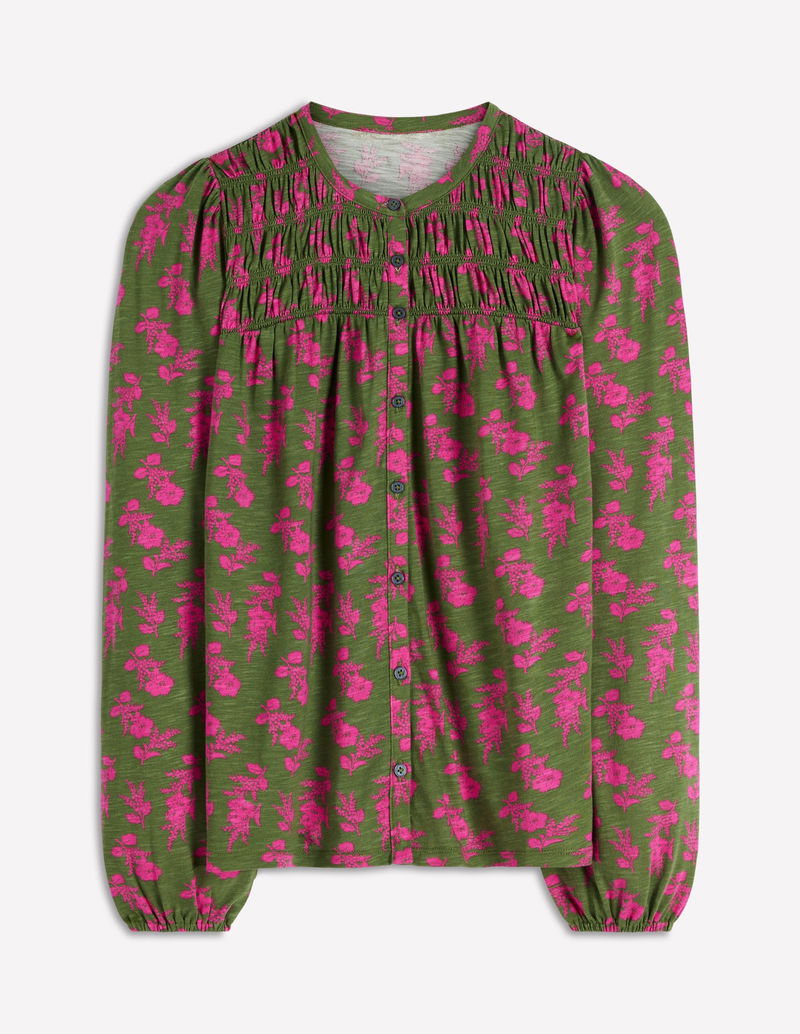 Mya Smocked Jersey Shirt-Olive, Blossomy Sprig