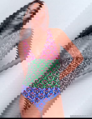 Mykonos deep v swimsuit. This fabric passes testing to UPF50+, protection is only provided on areas covered by fabric, you should still wear SPF sunscreen. Protection may also be reduced when wet or stretched.