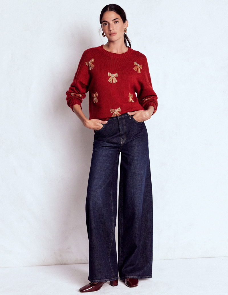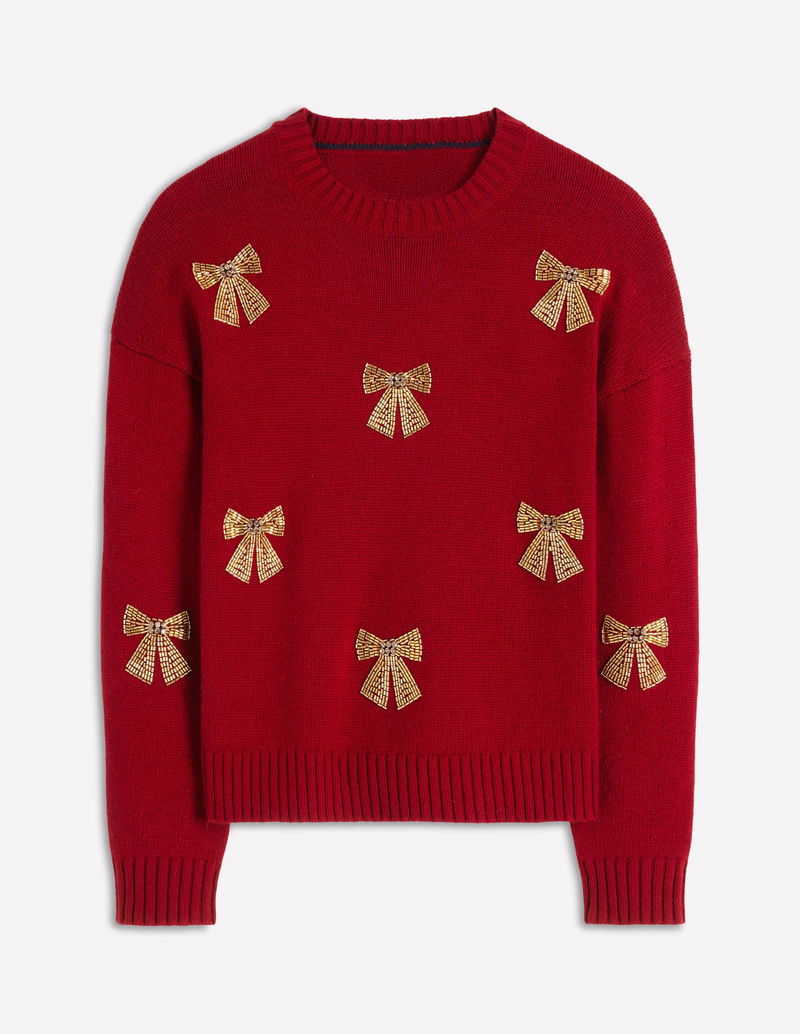 Natalie Embroidered Jumper-Red, Embellished Bows