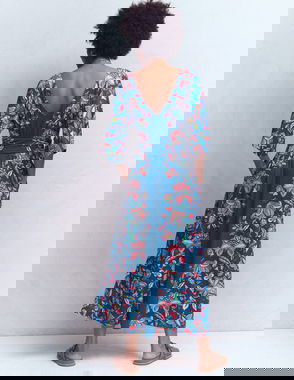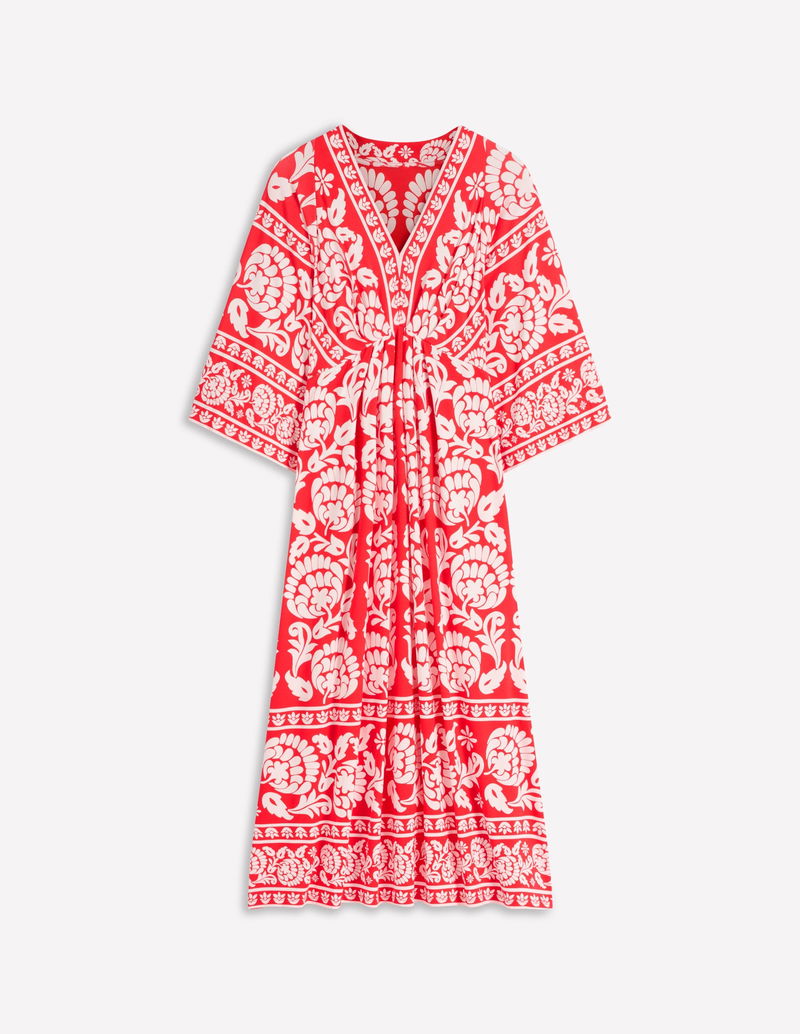 Nell Kimono Midi Jersey Dress-Bright Cherry, Ornate Floret