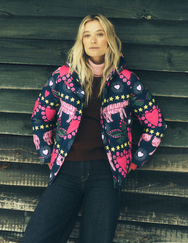Padded Puffer Coat-French Navy, Embellished Tiger