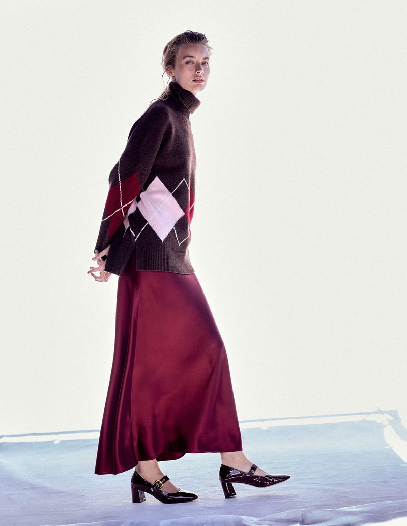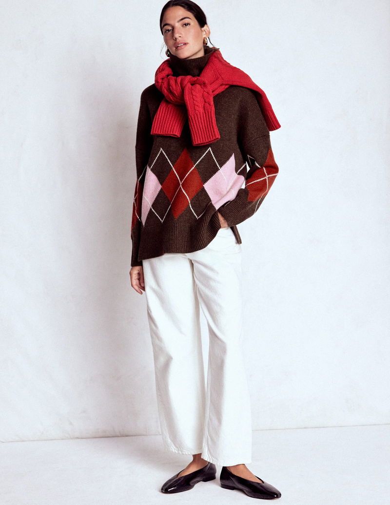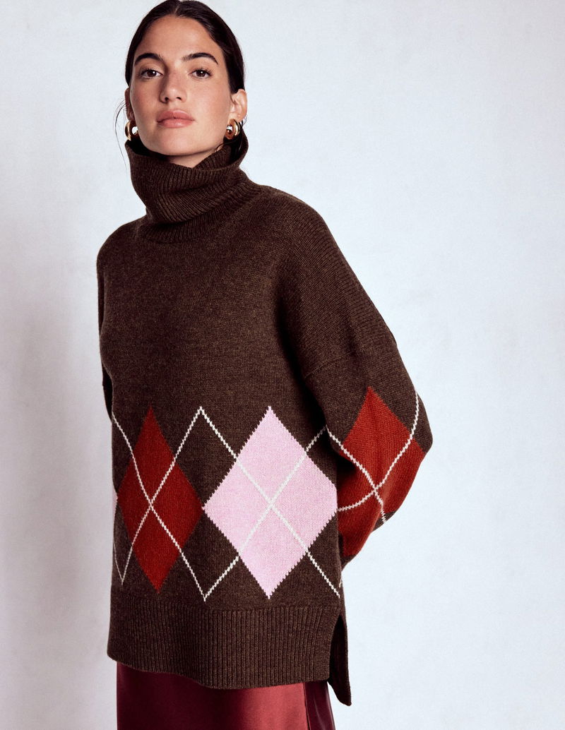 Polly Merino Roll Neck Jumper-Brown, Pink Argyle