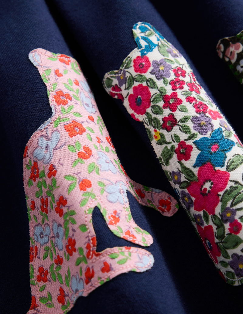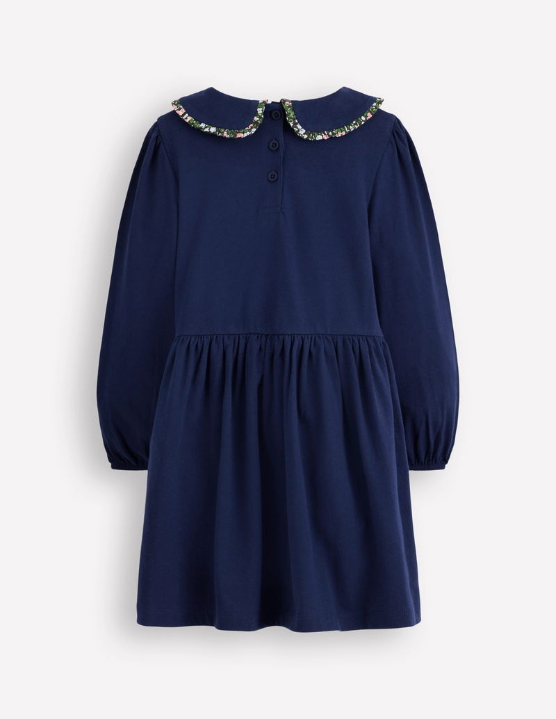 Minis can pick their favourite appliqué design – cats or horses – on this nostalgic jersey dress. The ditsy fabrics are also a charming ruffle around the collar and it's made of 100% soft cotton.