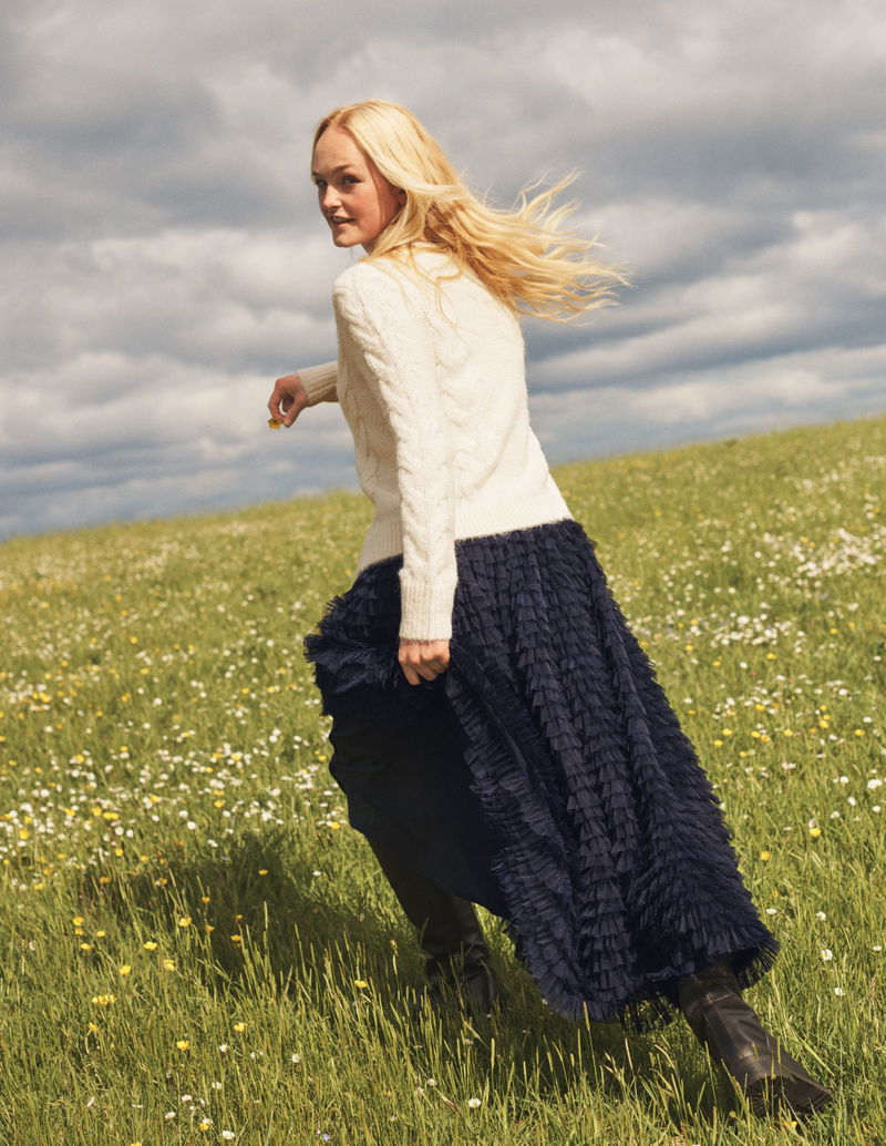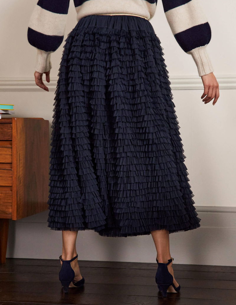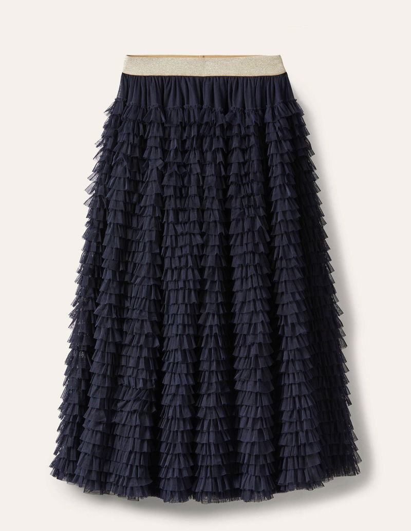 Ready to party? Us, too. And we’ve got just the thing. Layers and layers of tulle (made from recycled polyester) give a full, ruffled look to this skirt – it’s fully lined, too. The metallic waistband sits just above the waist to flatter, and the length finishes at the low calf – perfect for showing off those shoes.