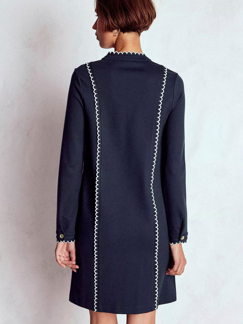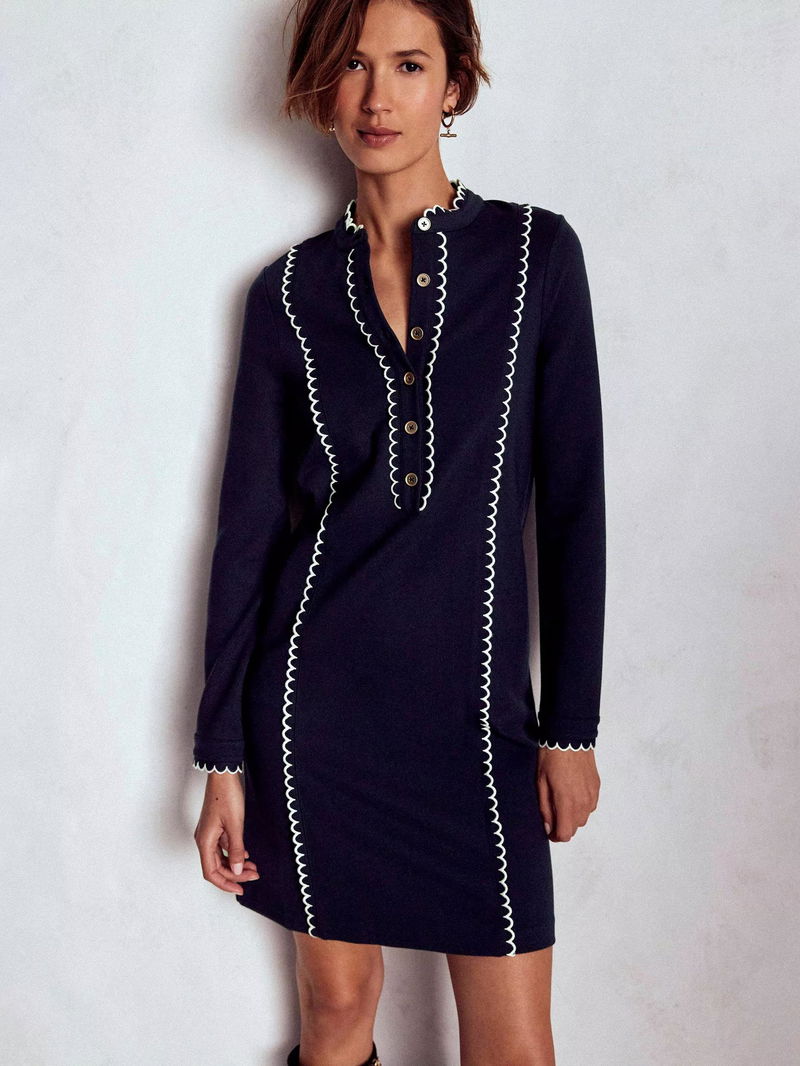 Replete with glimmering buttons, scallop trim (front and back) and crease-free fabric, there's nothing routine about this detail-orientated shift dress. That said, it will help you breeze through weekday mornings.