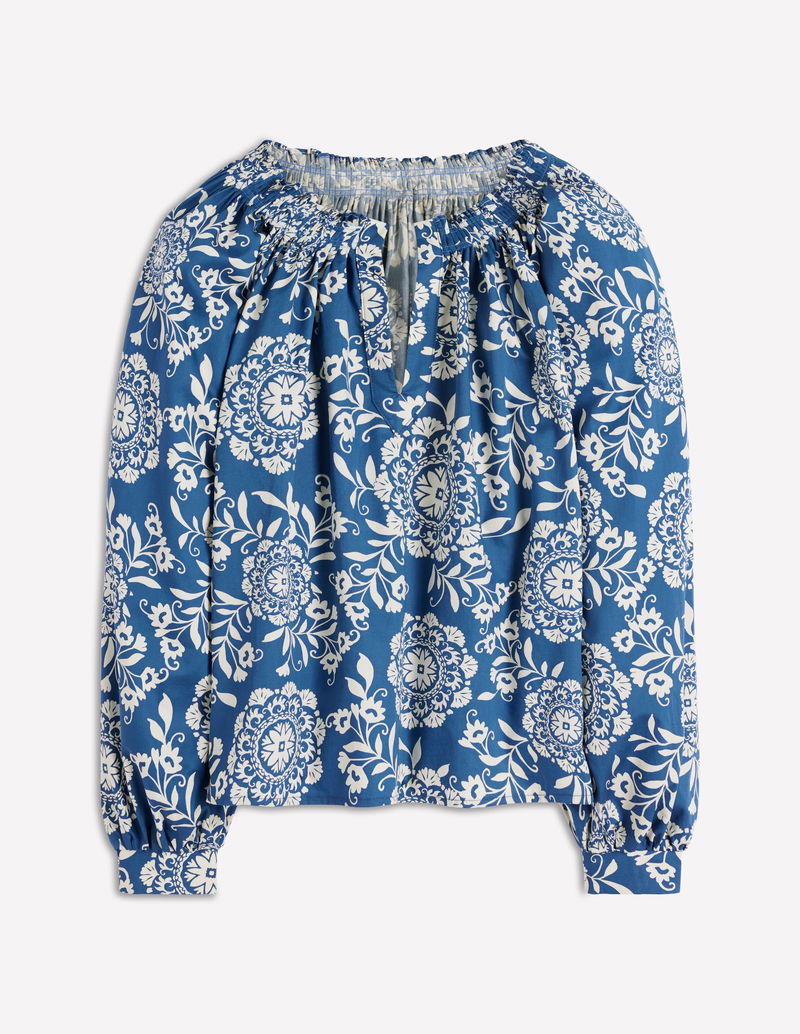 Serena Pleat Neck Top-Dark Blue, Decorative Blossom