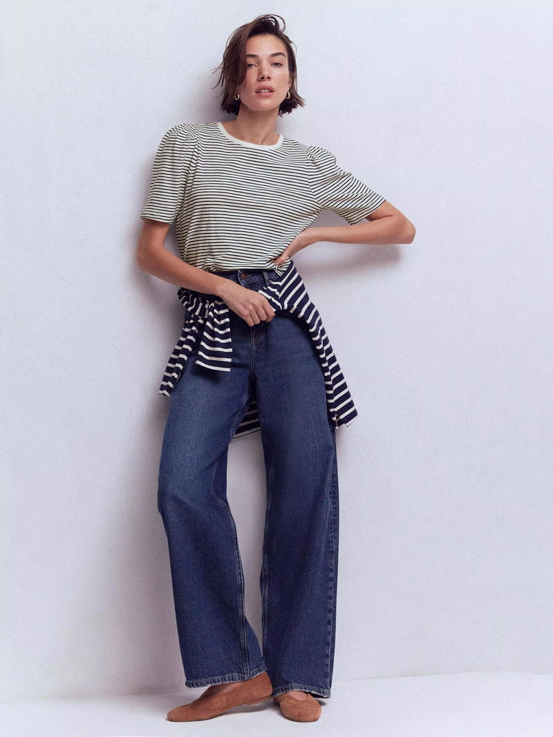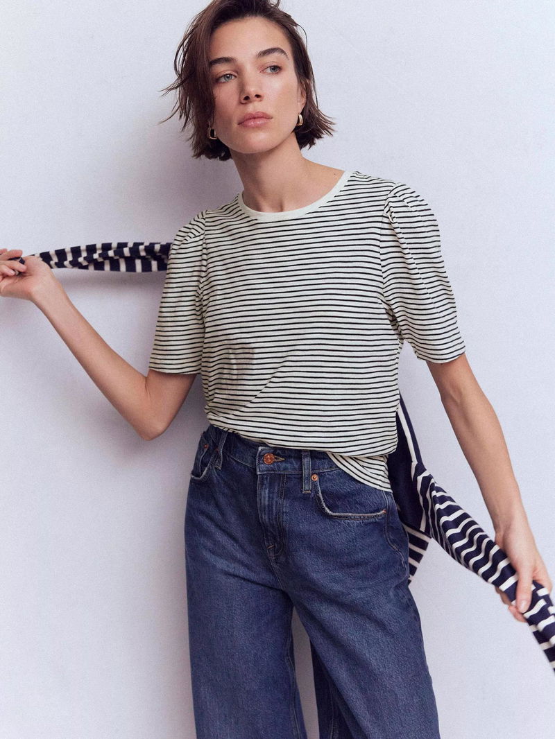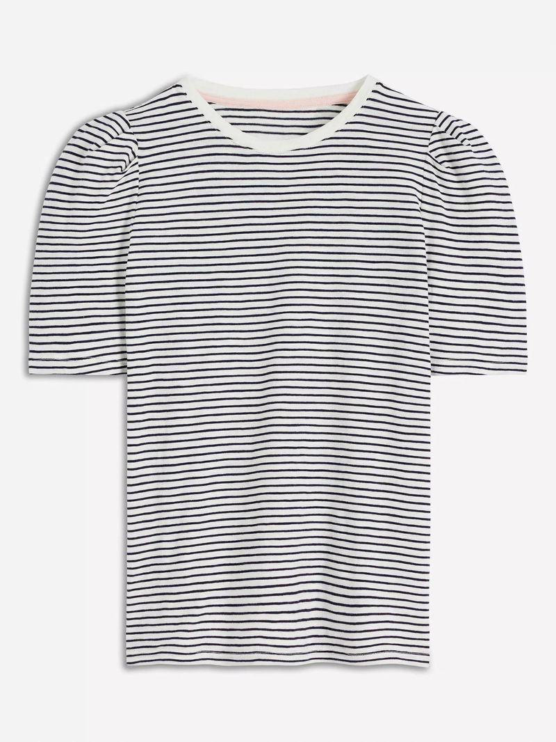 Stripe Pleat Sleeve T-Shirt, Navy/Ivory