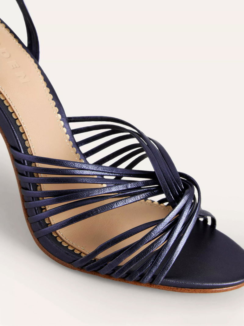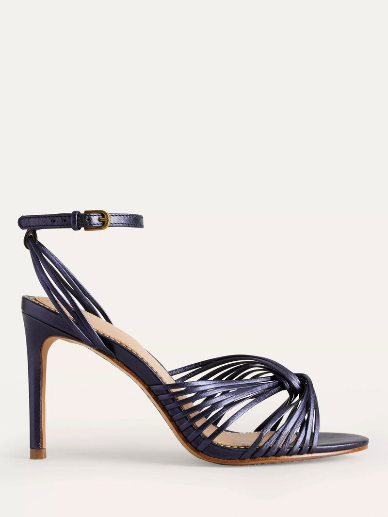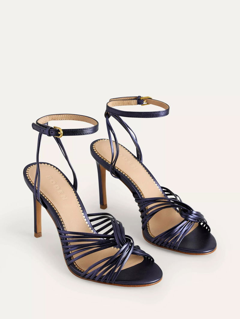 Twist Front Leather Stiletto Heel Sandals, Navy Metallic