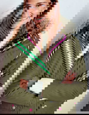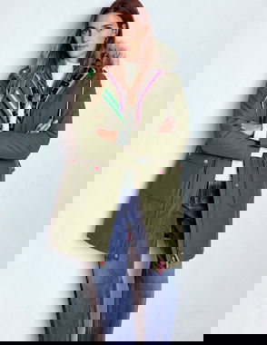 This stylish padded puffer features a horizontal quilt pattern and longline shape. The shape is modern, with a collarless neckline and front zip. Side pockets are handy and warm, while a navy herringbone trim and berry-coloured piping add colourful contrast.