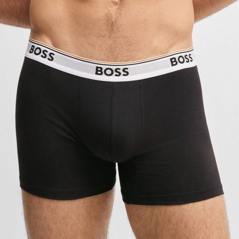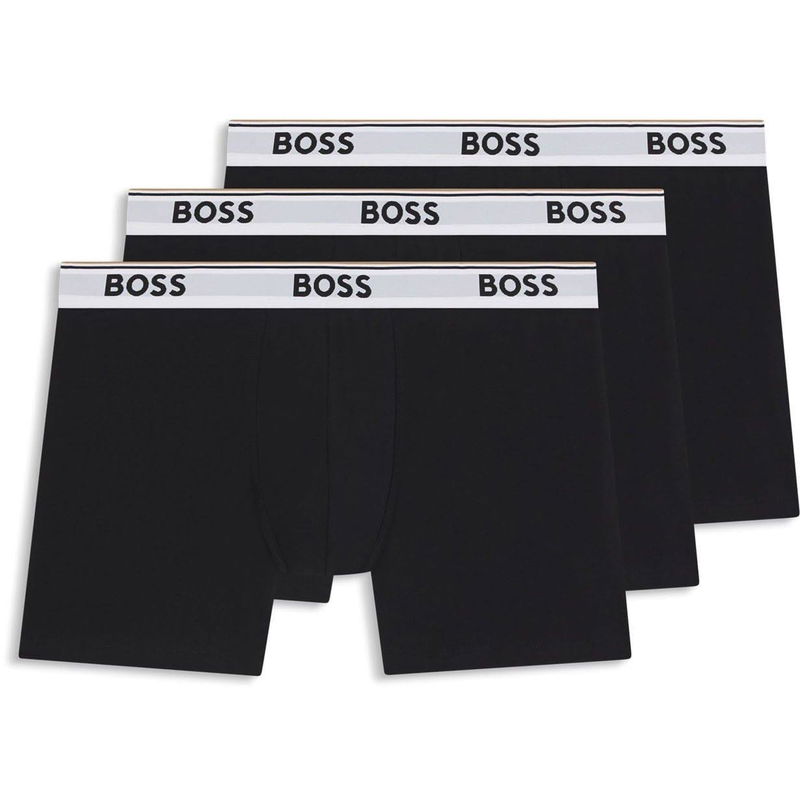 Mens BOSS 3 Pack of Stretch Cotton Boxer Briefs with logos in black Three pairs of boxer briefs by BOSS. Crafted in soft cotton blended with a touch of stretch to offer ultimate comfort these boxer briefs are topped with an exposed waistband that sits at a regular rise. A signature stripe and repeat BOSS branding complete each pair.