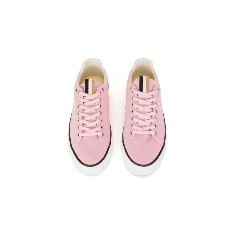 Mens BOSS Aiden Tennis Trainers in light pastel red. Sleek low profile BOSS' Aiden tennis trainers are crafted from crisp canvas with vulcanised rubber soles to support outdoor impact. The label's signature beige black and white grosgrain trim is showcased on the tongue.