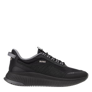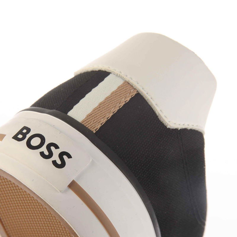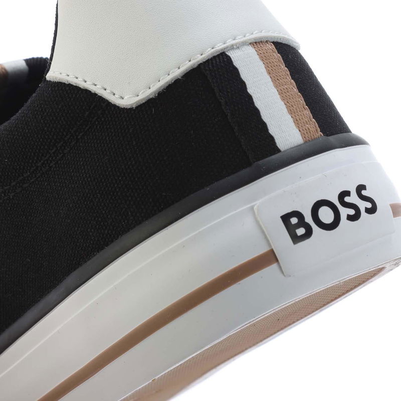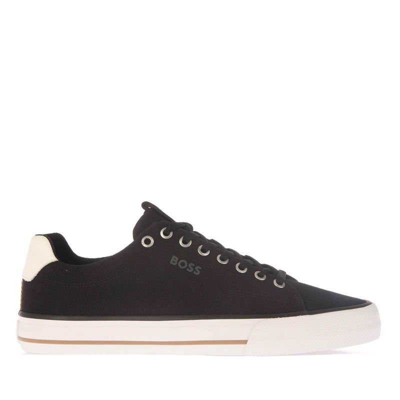 Mens Boss Aiden Tennis Trainers in black. Textile upper. Lace up fastening. Low ankle collar. Signature BOSS three stripes woven logo pinch tag. Contrast side panel logo. Vulcanised rubber outsole.