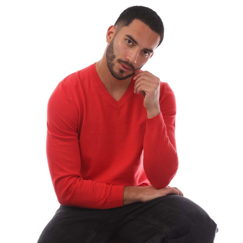 Mens BOSS Barnabas Sweater in red. V-neck. Ribbed knit trim details. Embroidered logo on the chest. Regular fit.