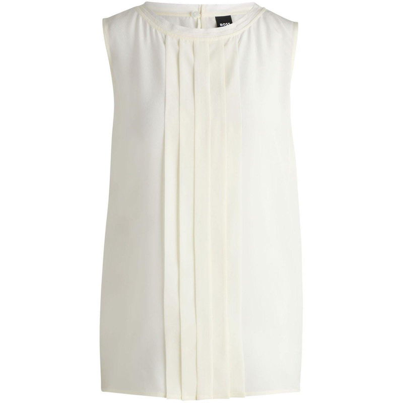 Womens BOSS Bemiula Pleat-front sleeveless blouse in washed silk A modern blouse with sleeveless styling by BOSS Womenswear. This collarless design is crafted in washed silk with front pleats for an elegant look.