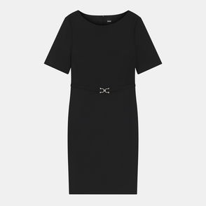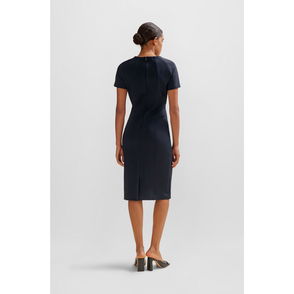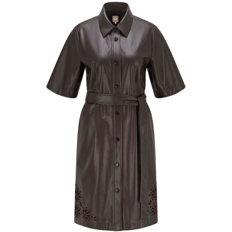 A short-sleeved business dress with a button-up front by BOSS Womenswear. Featuring elegant broderie anglaise detailing at the hemline this fully lined dress is crafted in faux leather with a coated finish for a subtle sheen. An adjustable tie belt offers definition at the waist.