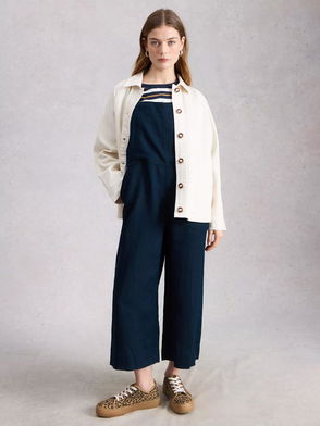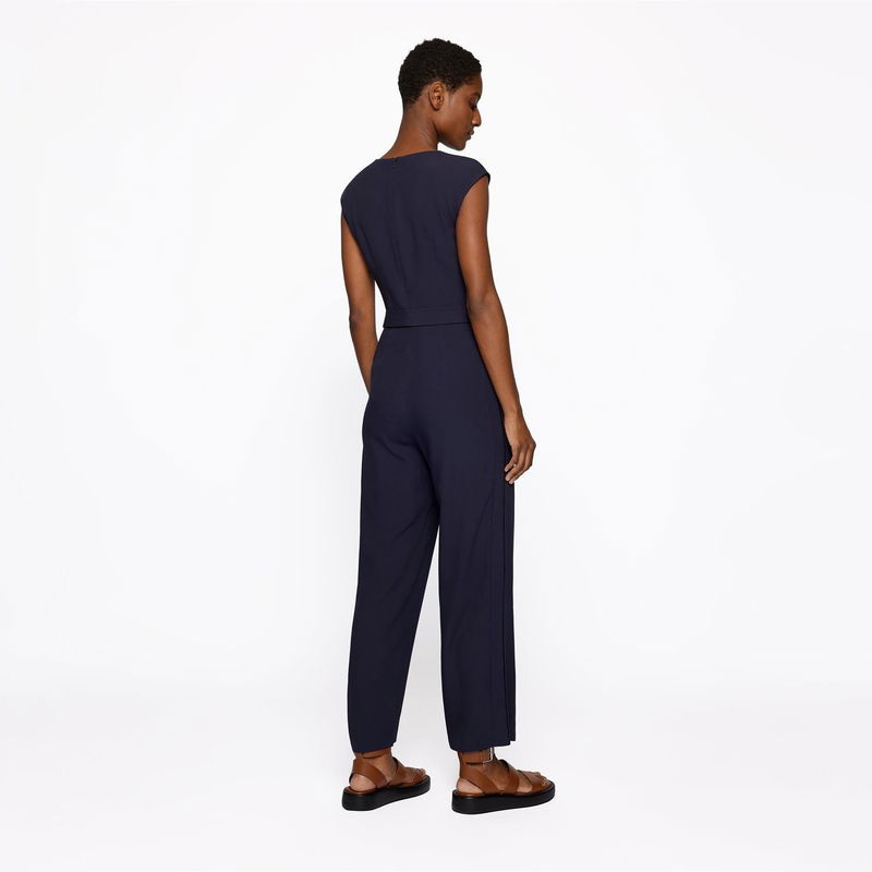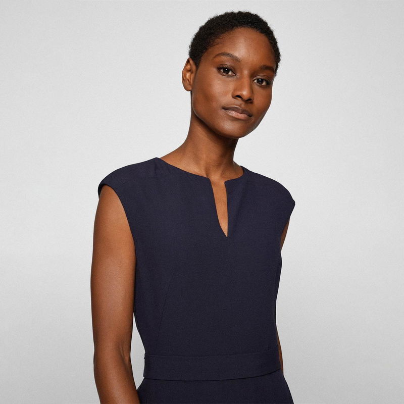 Womens BOSS Dimpa Jumpsuit in dark blue. This jumpsuit by BOSS is made from an acetate-viscose mix and has a fitted cut. It comes in a plain design with a V-neck waistband and side pockets.