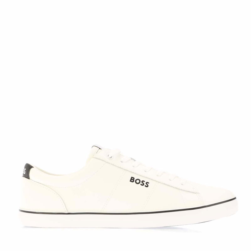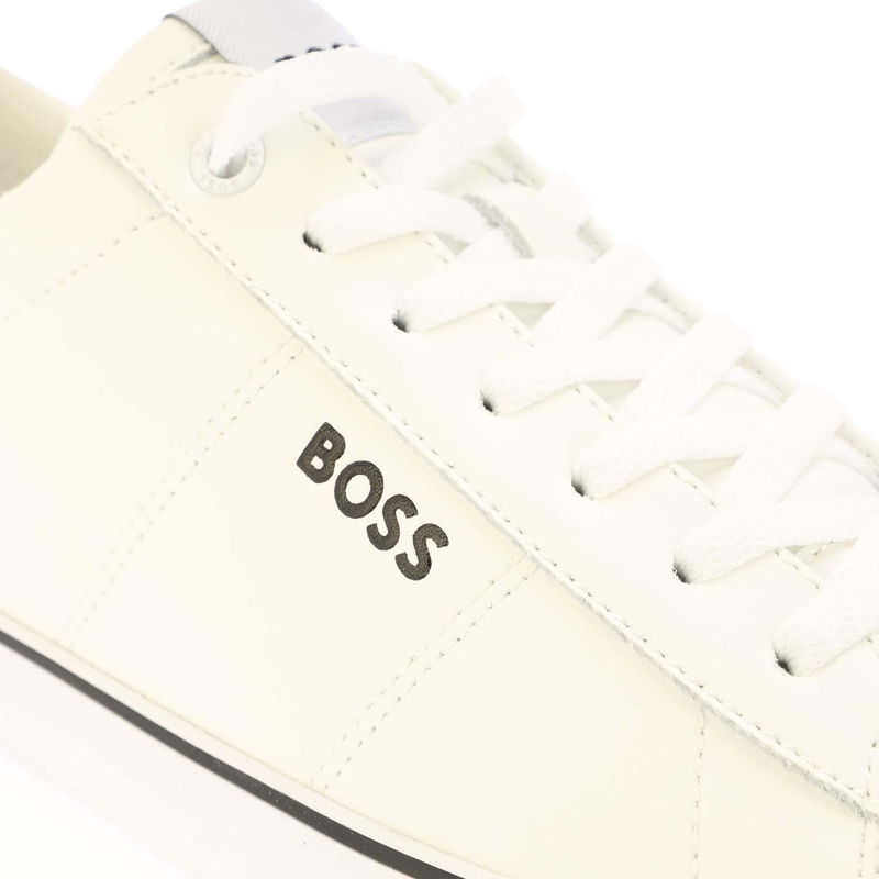 Mens Boss Jodie Tennis Trainers in white. Textile upper. Lace up fastening. Trim detailing. Signature BOSS branding. Vulcanised sole.