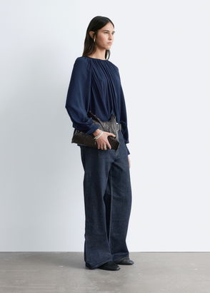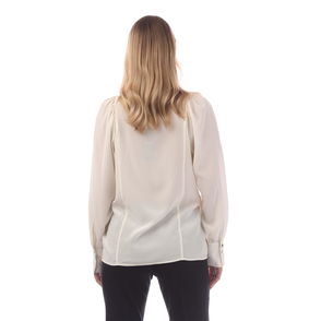 This fashion blouse showcases clean lines with a structured shape. The long sleeve design incorporates volume at the arms while maintaining a sleek bodice for balanced form.