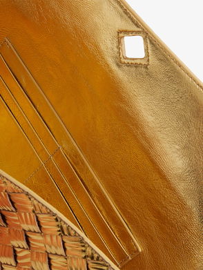 Bottega Veneta leather clutch bag. Top-handle, knotted closure, front flap, all-over interwoven design, one main compartment, six interior card slots, interior slip pocket, lined.
