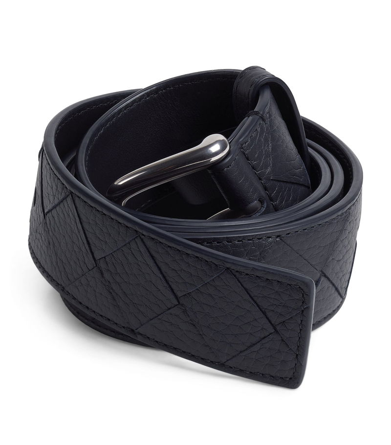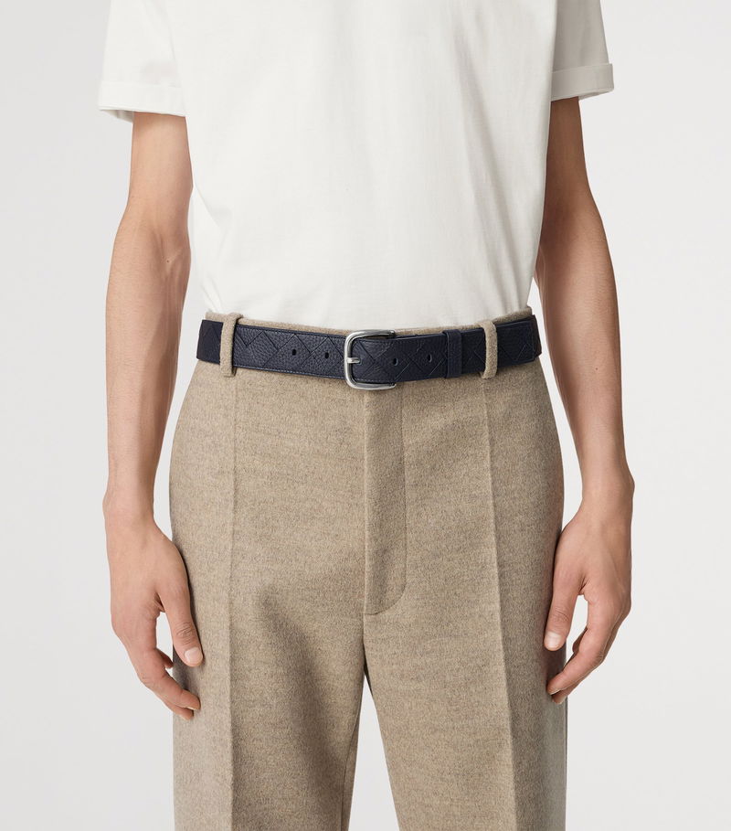 An essential accessory for the discerning gentleman, this Bottega Veneta belt features the iconic Intrecciato weave in grained leather. Fastened with a silver-tone rounded buckle, the intricate piece slips through the belt loops of everything from chinos to suit trousers, completing your ensemble with Italianate polish.