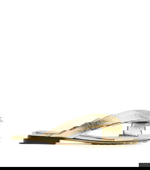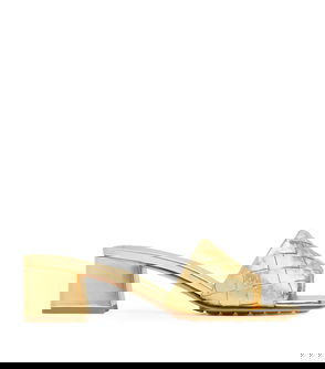 Bottega Veneta abandons its signature weaving in favour of a metallic leather finish in the streamlined Riva mules.