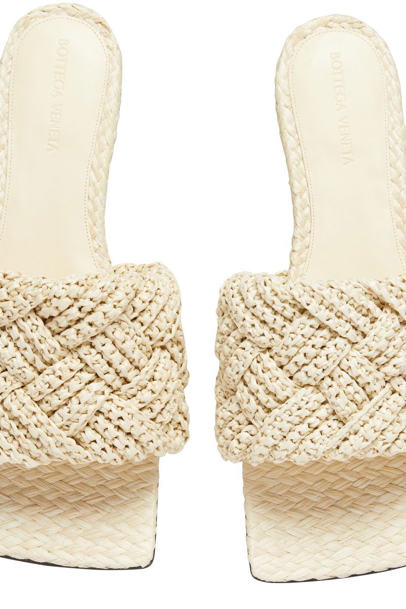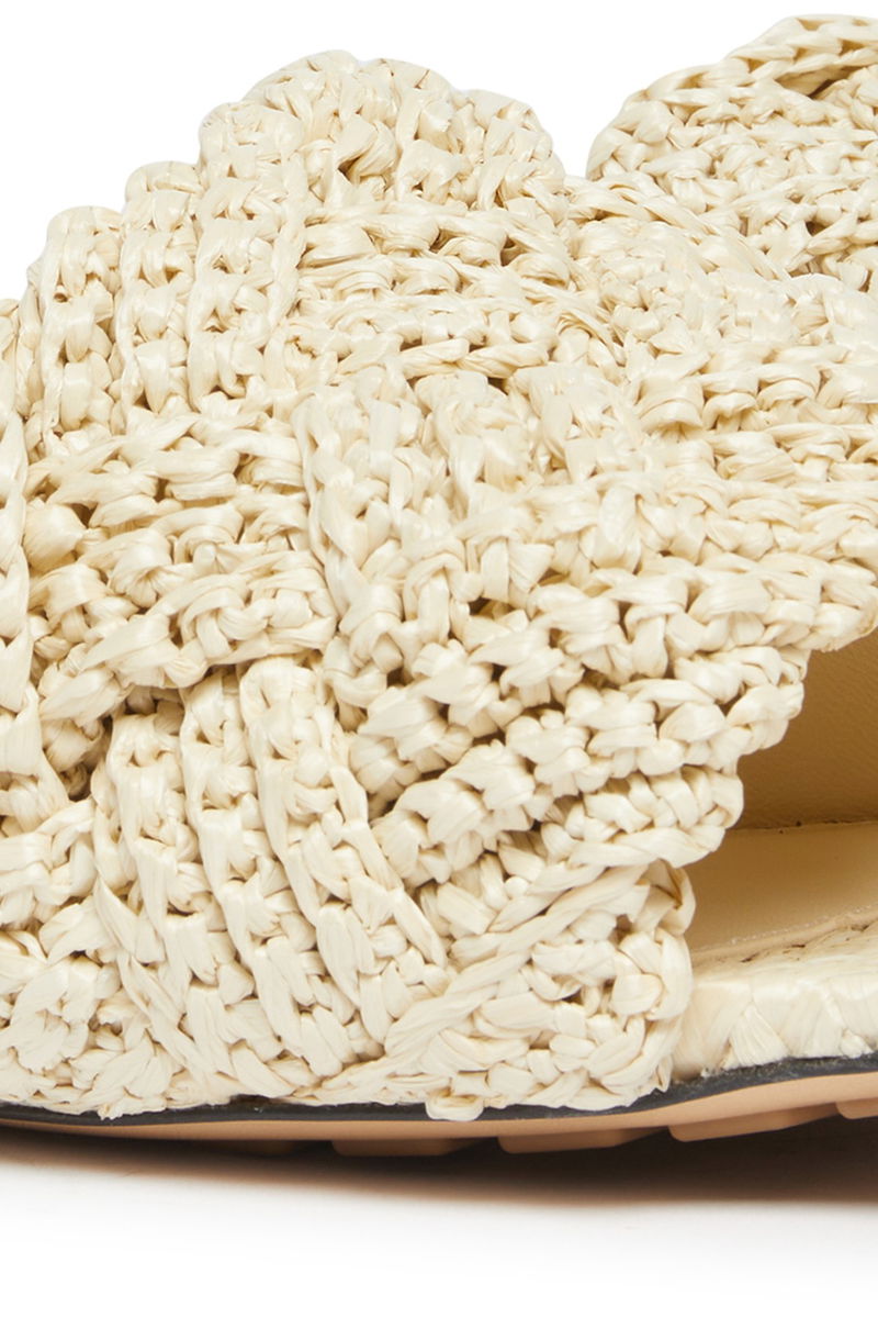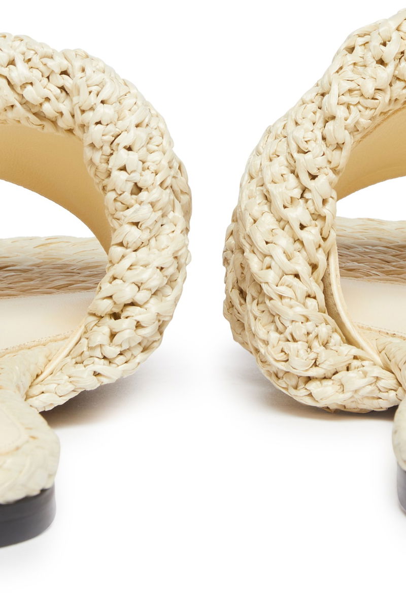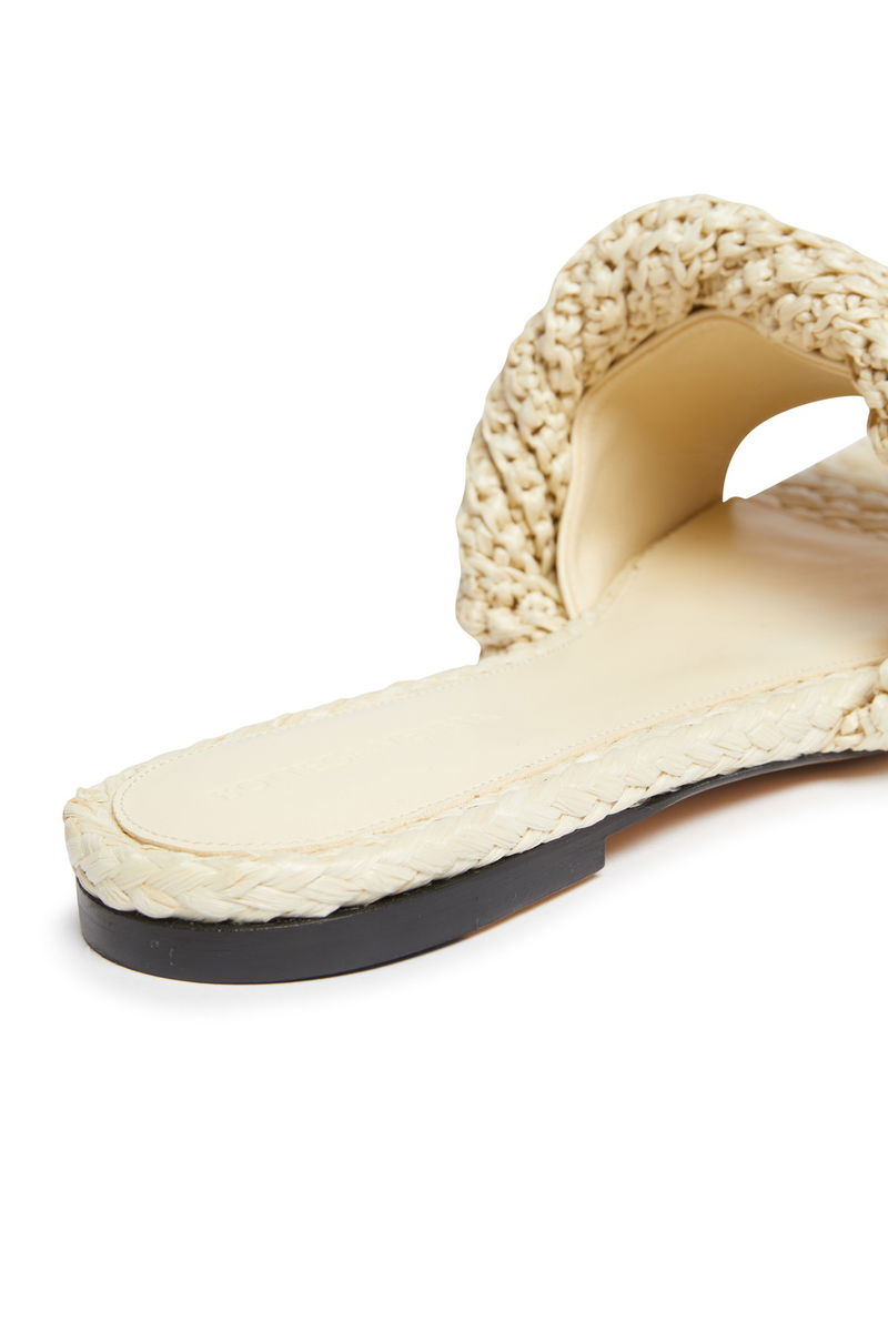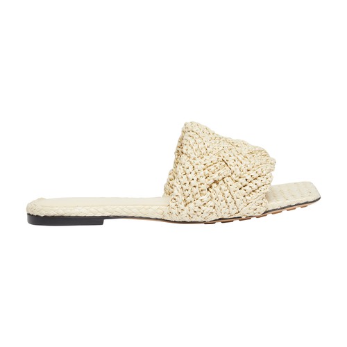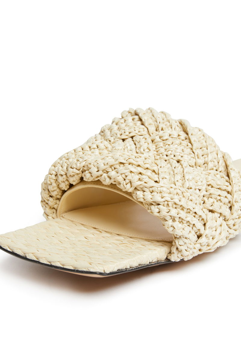 Open square toe, twist detail, flat heel, rubber-injected leather sole.