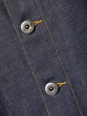 Bottega Veneta denim jacket. Exposed button fastening at front. Relaxed fit, leather spread collar, long sleeves, buttoned cuffs, three patch pockets and brand patch at front, all-over padded, fully lined.