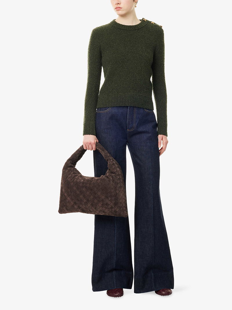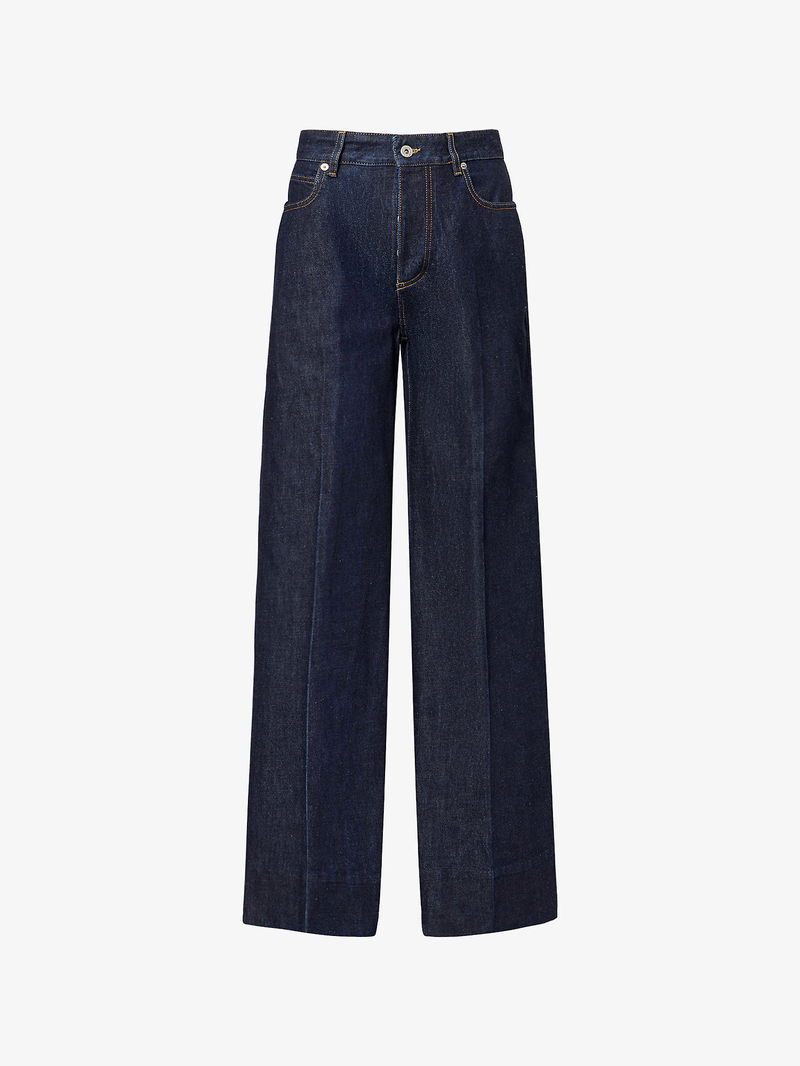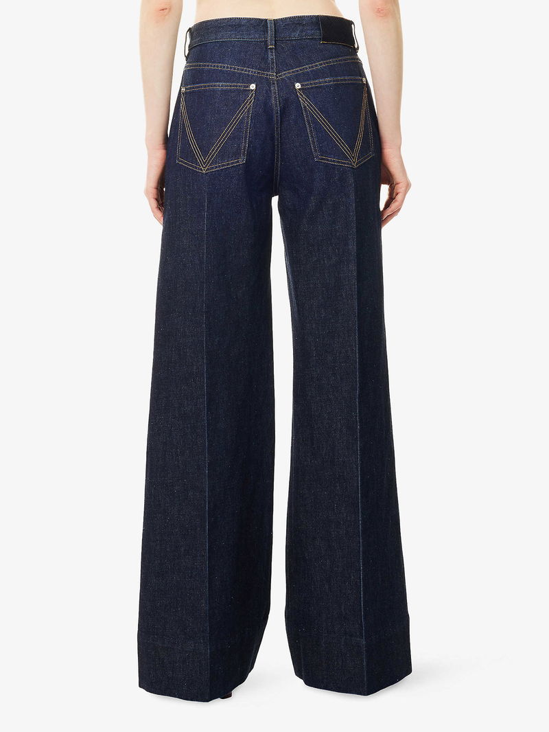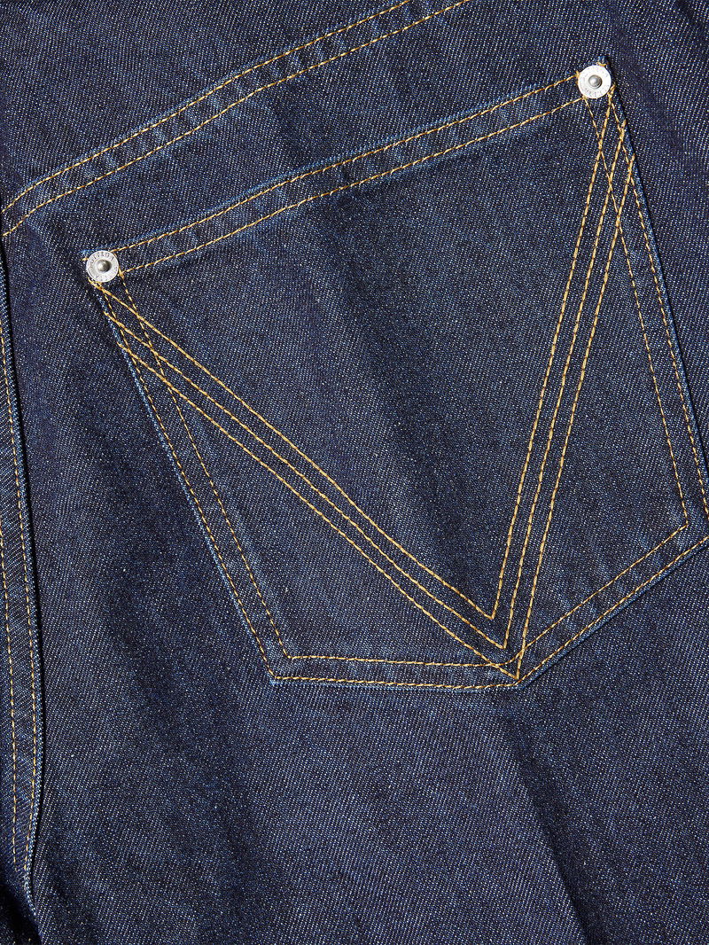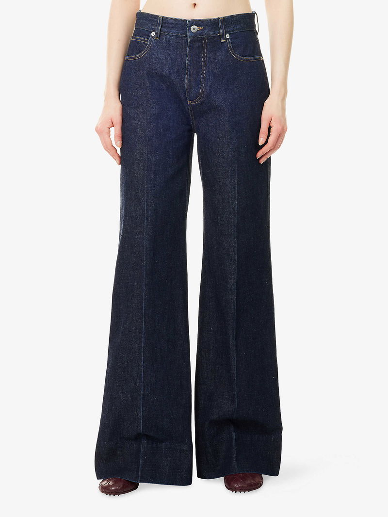 Bottega Veneta denim jeans. Exposed button and concealed button-fly fastening at front. Relaxed fit, high-rise, straight leg, belt loops, five pockets, double-faced weave patch at back.