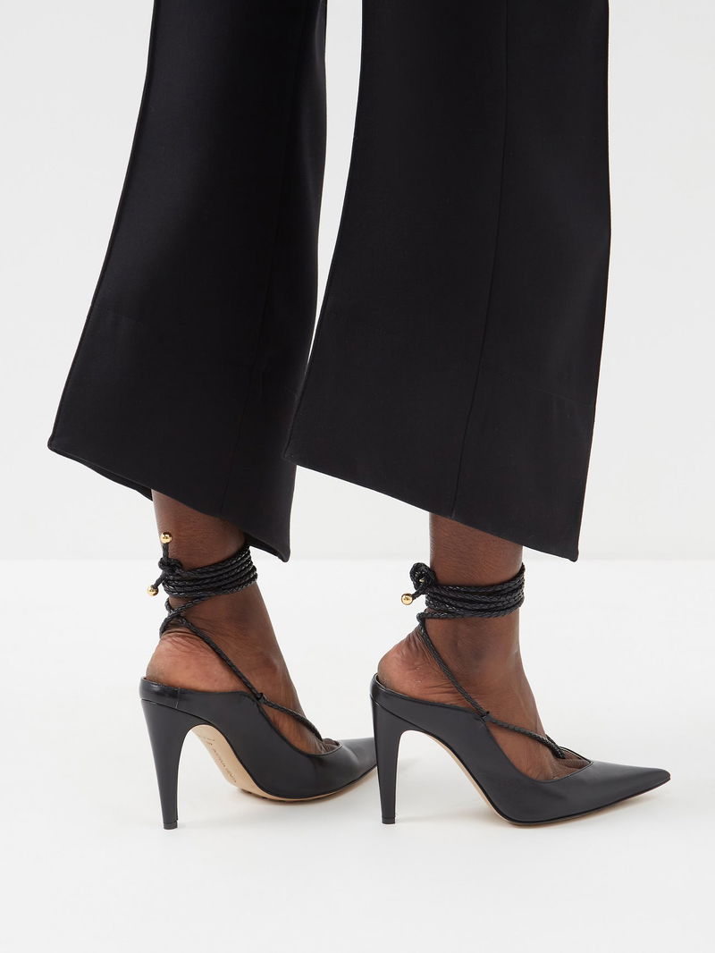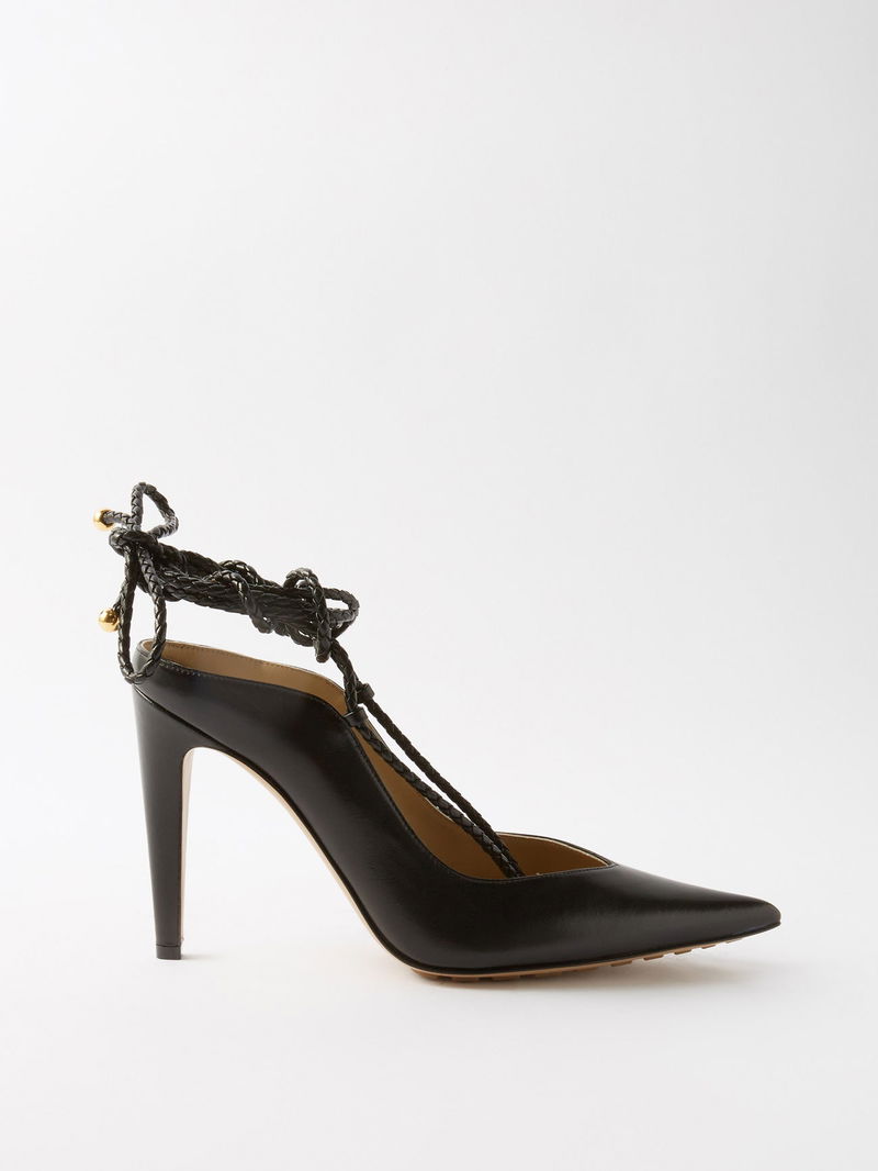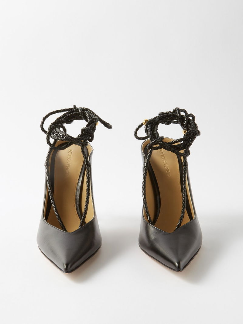 Bottega Veneta puts its signature contemporary twist on the classic point-toe profile of these black Spritz leather pumps with elegant, braided lace-up straps.