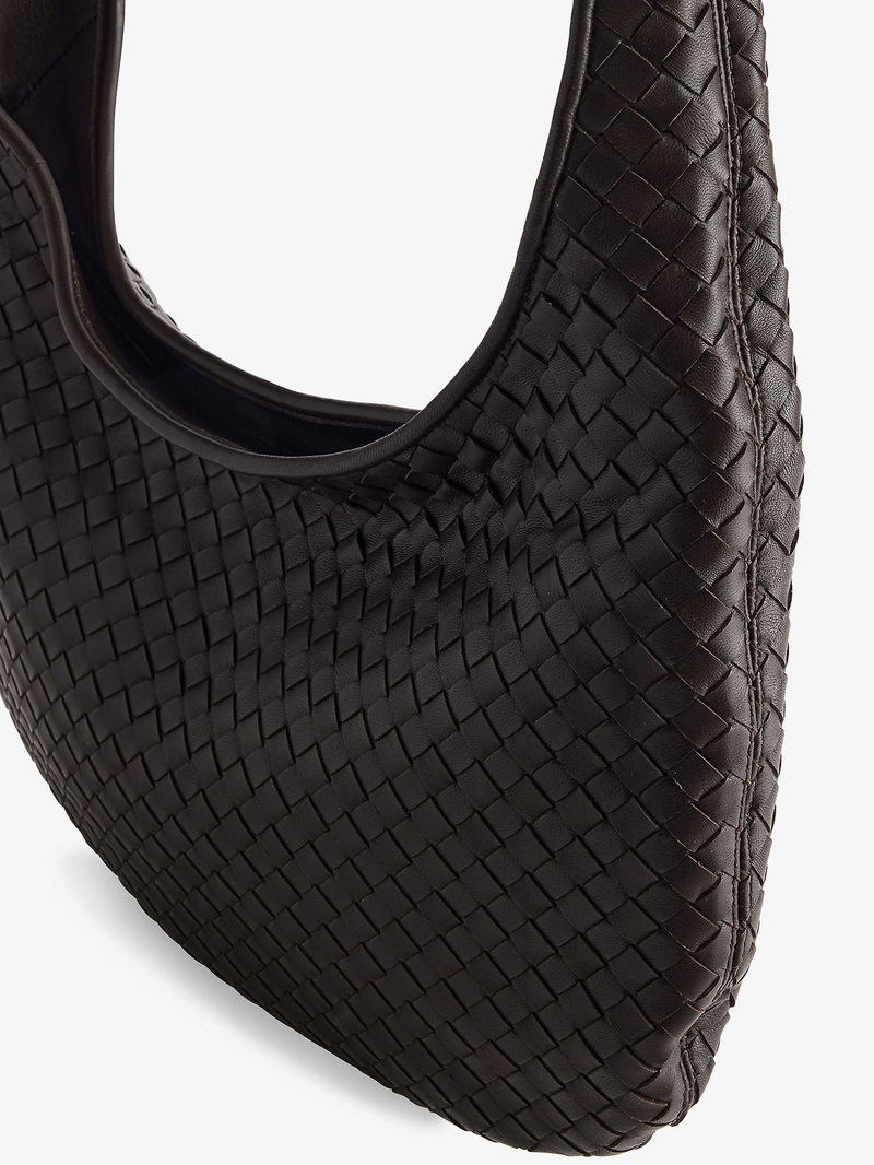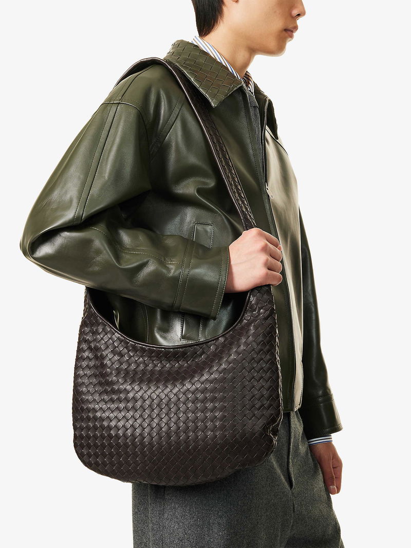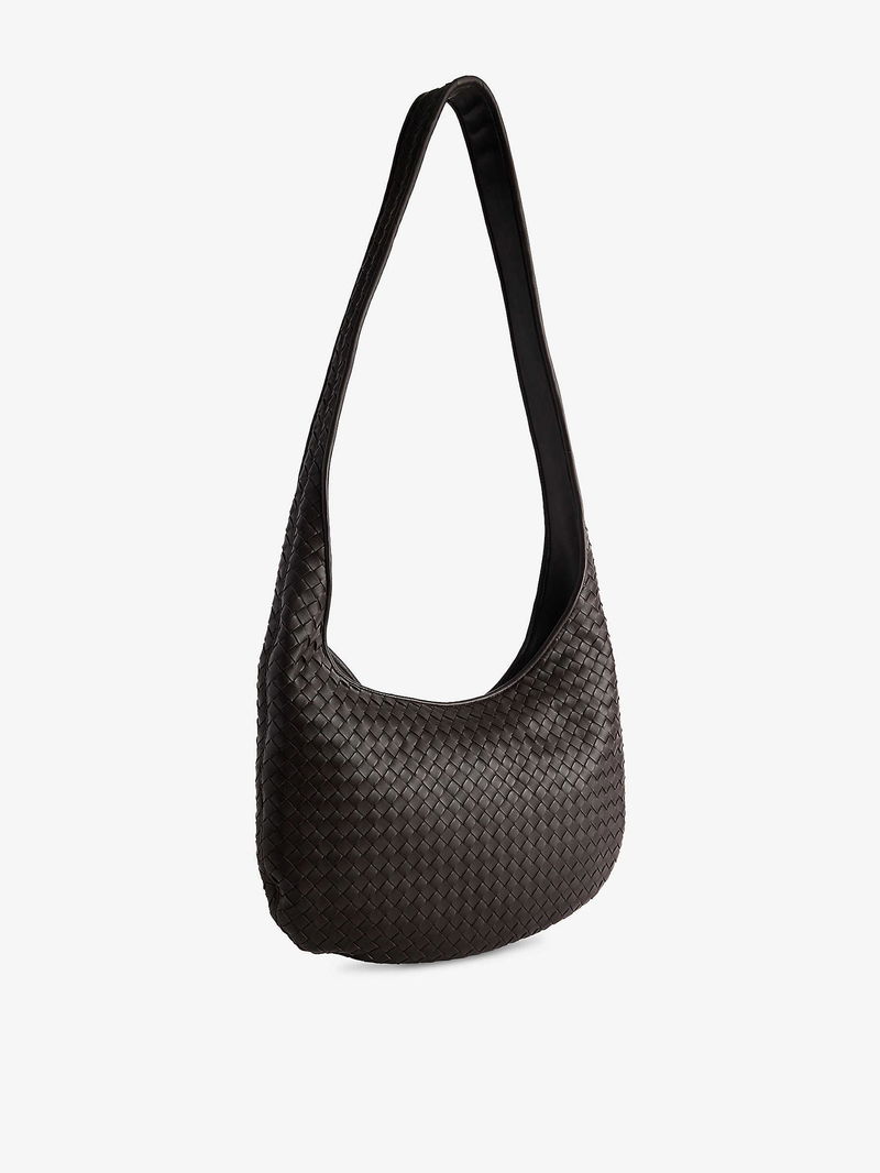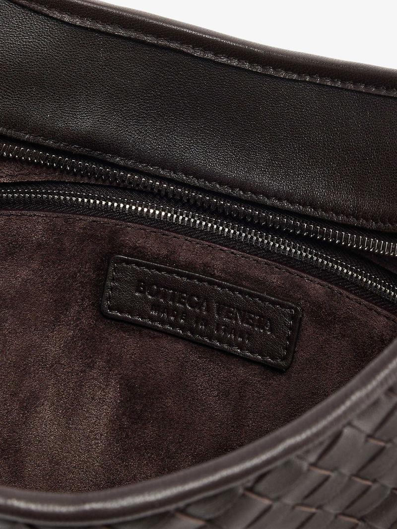 Bottega Veneta leather cross-body bag. Rounded shape, one long shoulder strap, one main compartment, one interior zip pocket, interior logo patch, intrecciato weave, silver-toned hardware, lined.