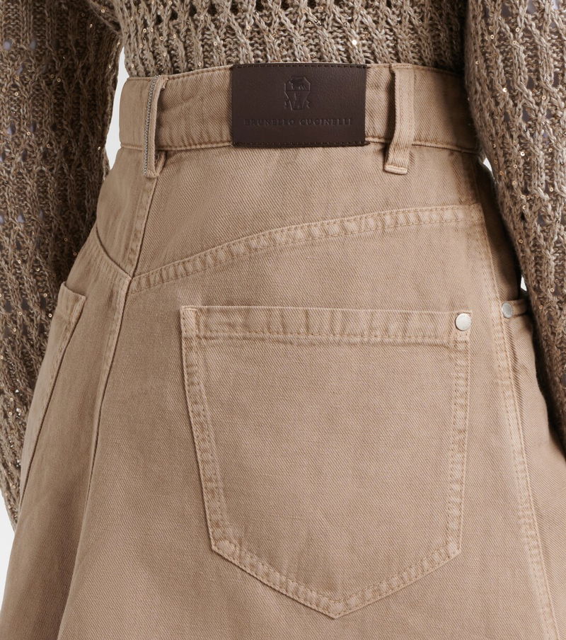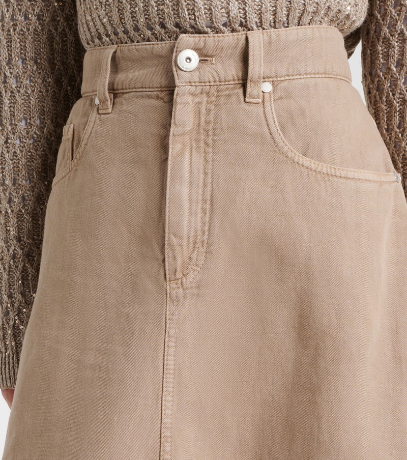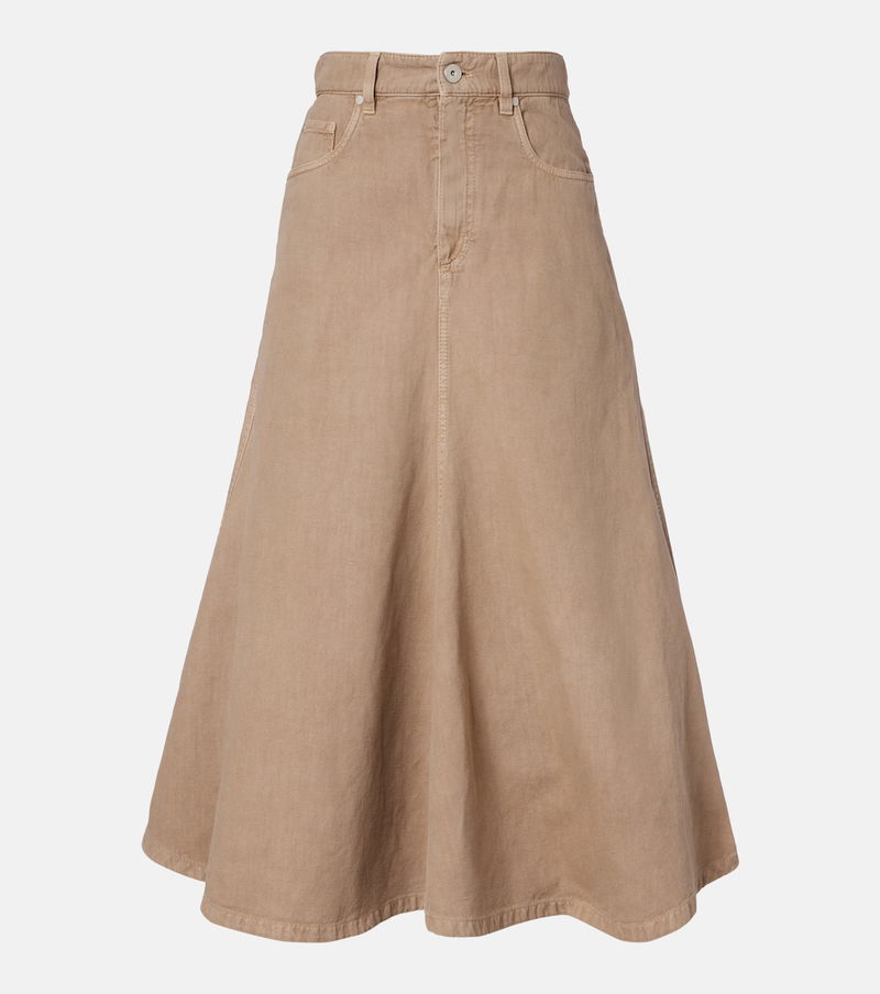 Brunello Cucinelli: where fine Italian craftsmanship, luxurious fabrics and timeless elegance meet. Made from cotton and linen denim, this midi skirt has an exaggerated silhouette and a logo-embossed leather patch at the back.