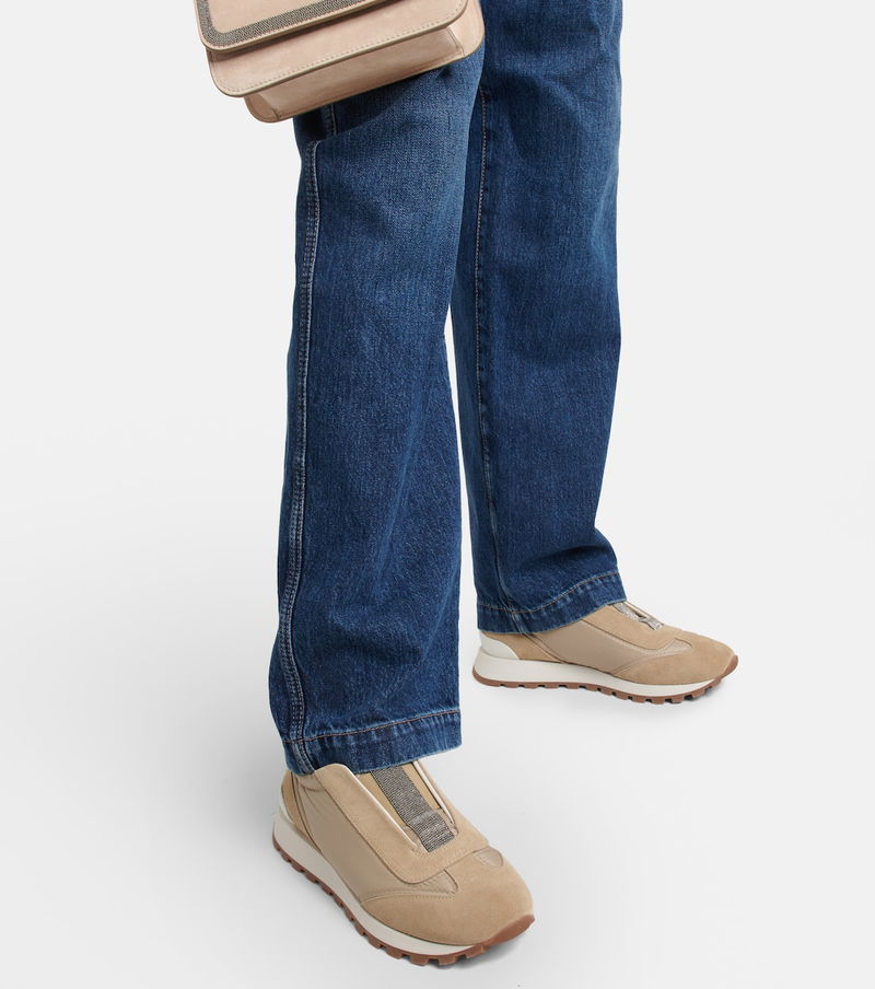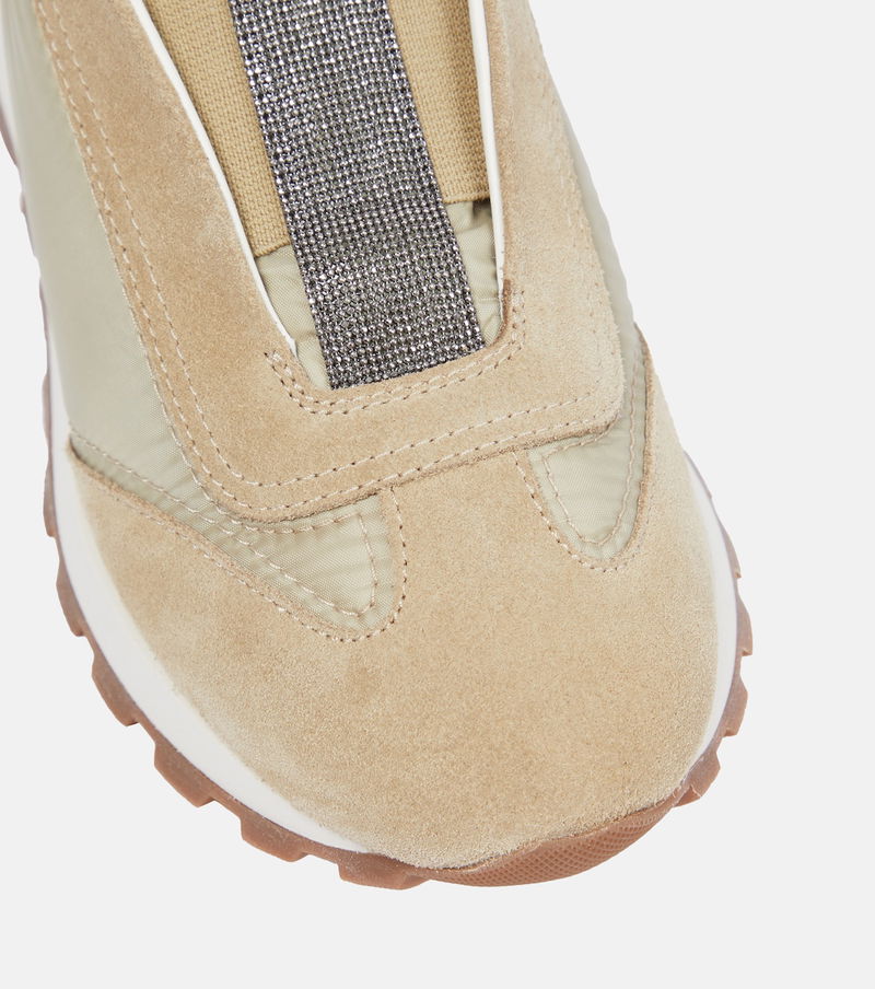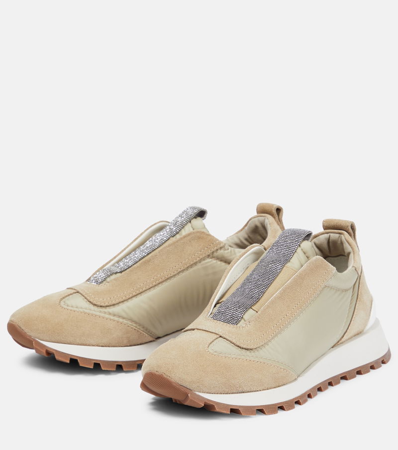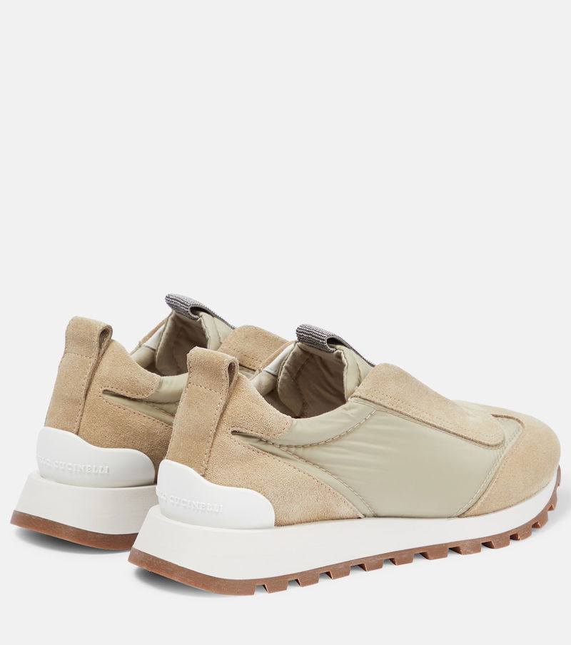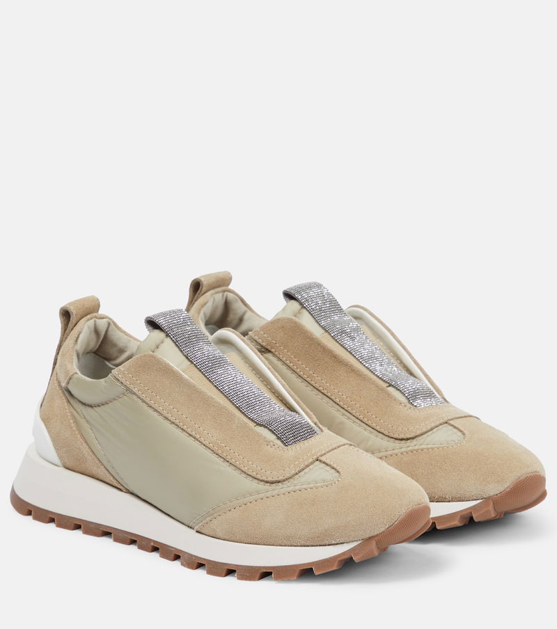 These slip-on sneakers from Brunello Cucinelli are detailed with hand-applied monili beads at the tongues for a luxurious twist. They’re made from panels of suede and padded technical fabric with ridged rubber soles.