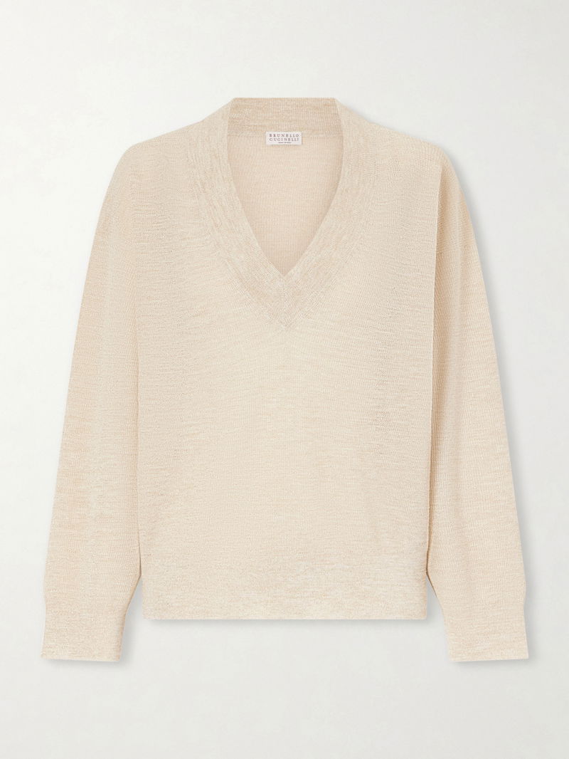 Brunello Cucinelli’s sweater is designed to carry from day to evening with effortless elegance. Knitted with plenty of linen for a lightweight feel, it’s traced with metallic fibres for a subtle glow.