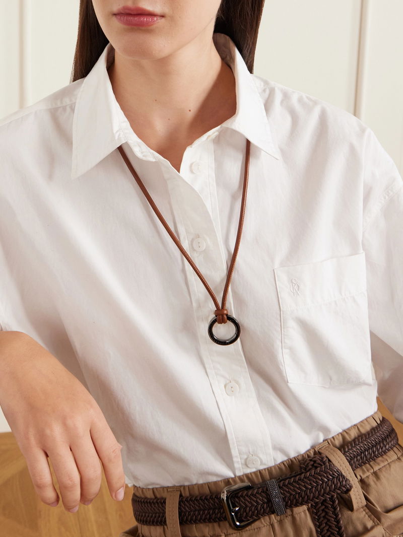 Brunello Cucinelli's necklace is an elegant yet practical warm-weather accessory. Crafted from knotted leather, it's punctuated with silver-tone hardware and a ring to attach sunglasses so they're never far from hand.