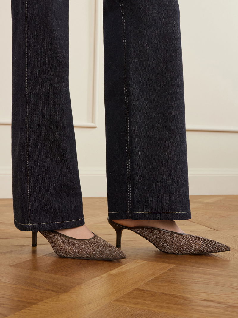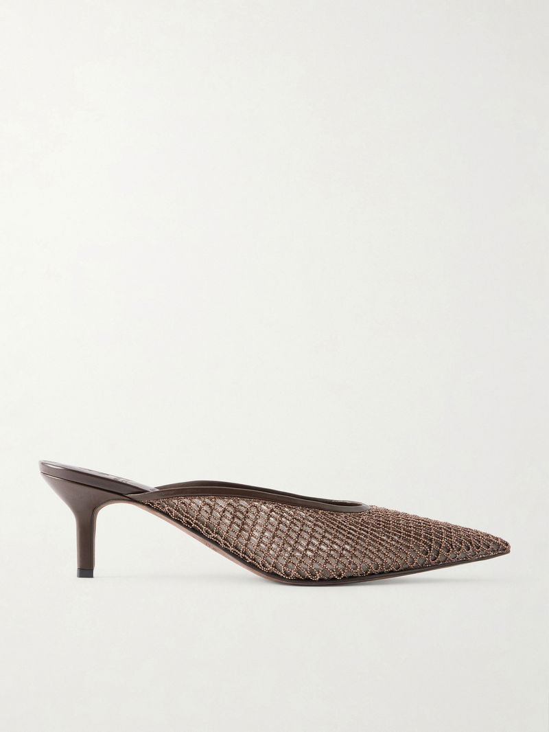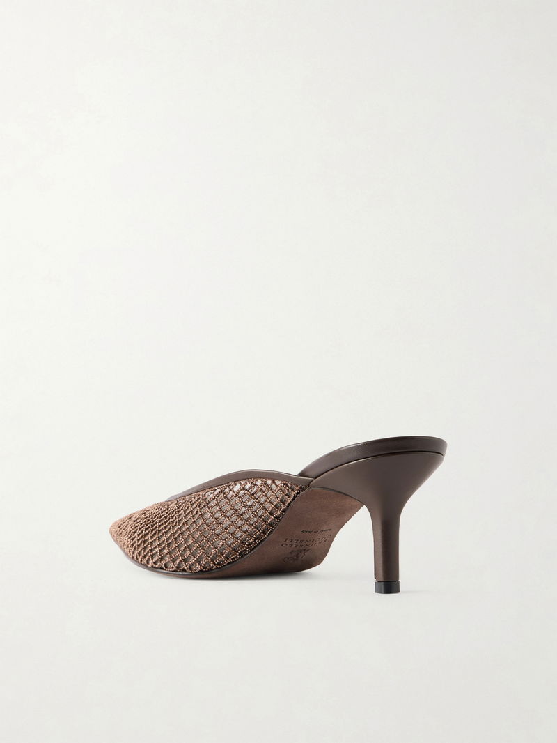 Leather-trimmed Bead-embellished Mesh Mules