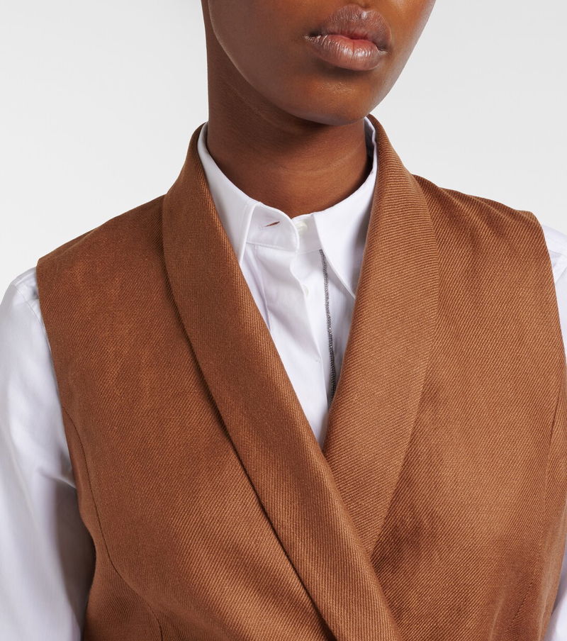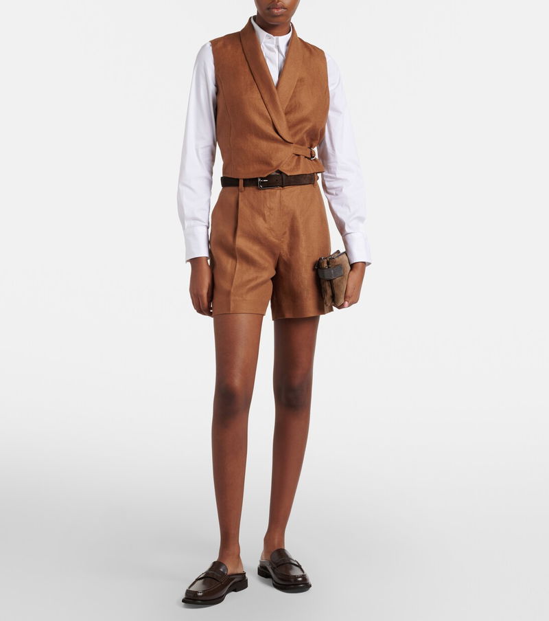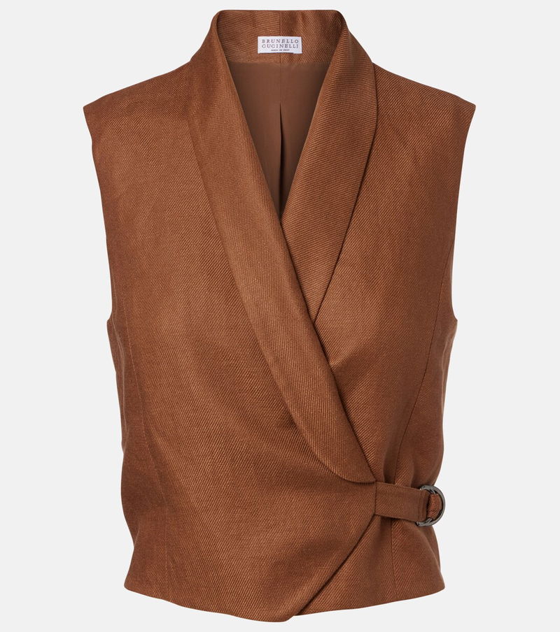 This vest from Brunello Cucinelli is tailored from linen to a slightly cropped silhouette. The design stands out with diagonal shawl lapels, complemented by a buckled side strap and fine Monili beading below the collar.
