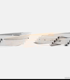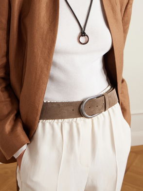 A Brunello Cucinelli signature, monili beading is made from nickel-free brass that's faceted to create a sparkling effect and hand-applied to each item. The detail is on the rounded buckle of this elegant suede belt.