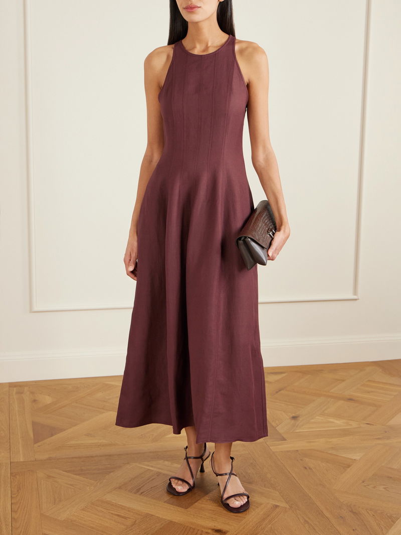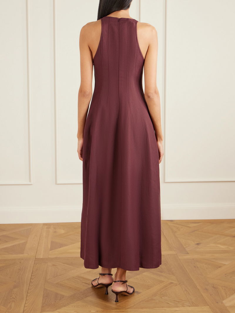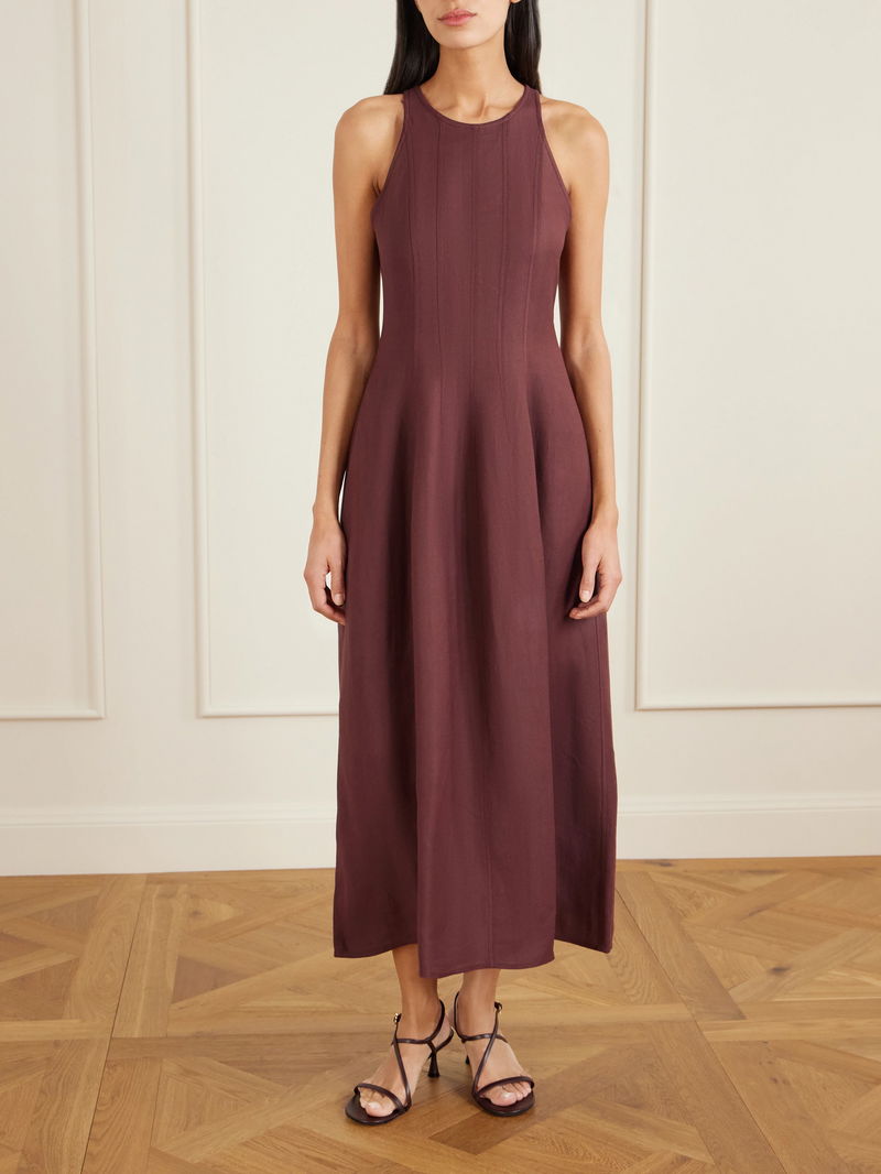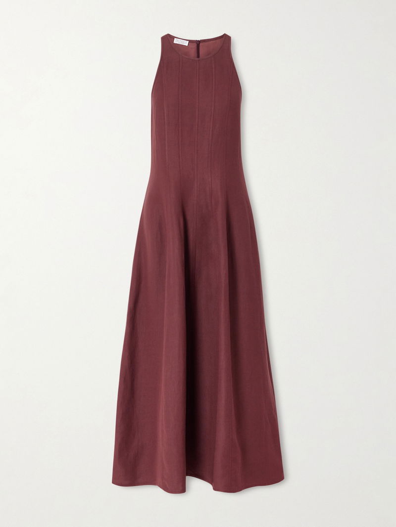 Brunello Cucinelli's dress is cut from panels of twill that meet at subtle seams along the fitted bodice. It's designed to nip in at the waist before gently flaring out to a floaty, softly pleated skirt and has a high neckline. Wear yours with flats or heels.