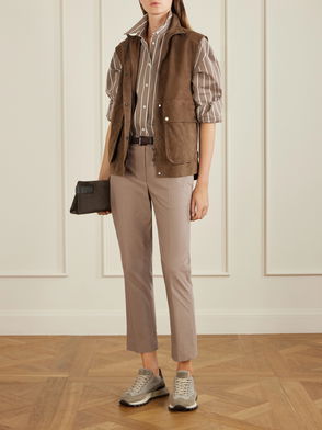 Brunello Cucinelli’s minimal basics and casual wear are elevated by luxury materials in sophisticated neutral tones and elegant details. From crisp cotton shirts, cashmere sweater dresses and leather blazers to puffer coats and suede and shearling bags, shoes and boots, pieces balance a relaxed aesthetic with a timeless quality.