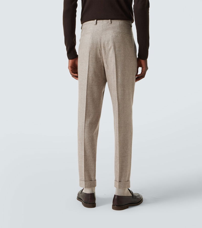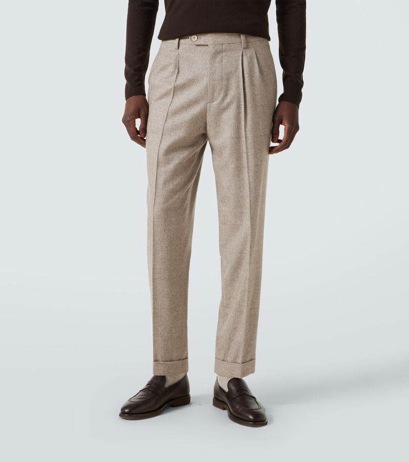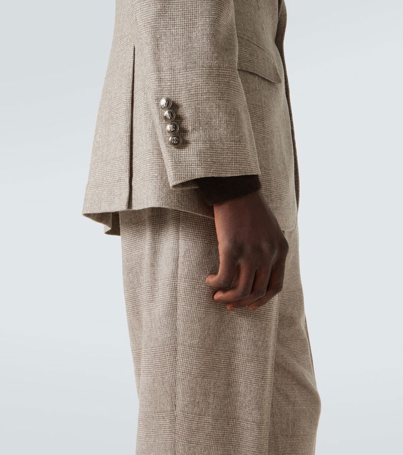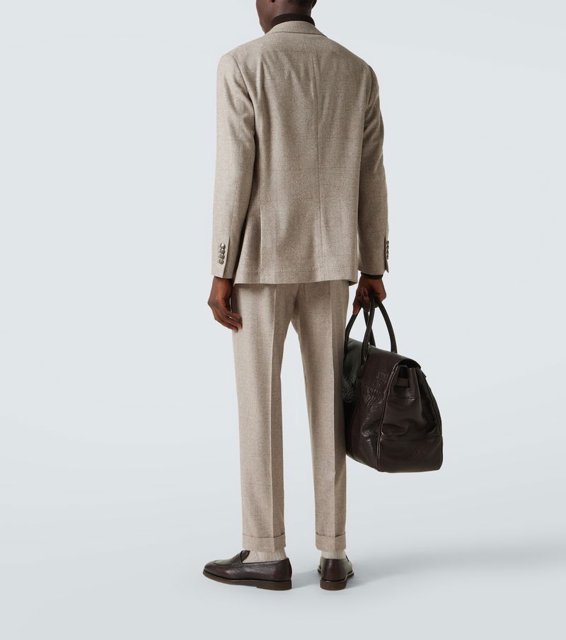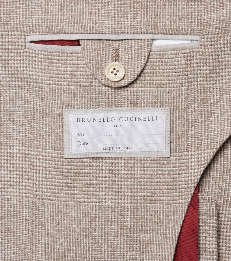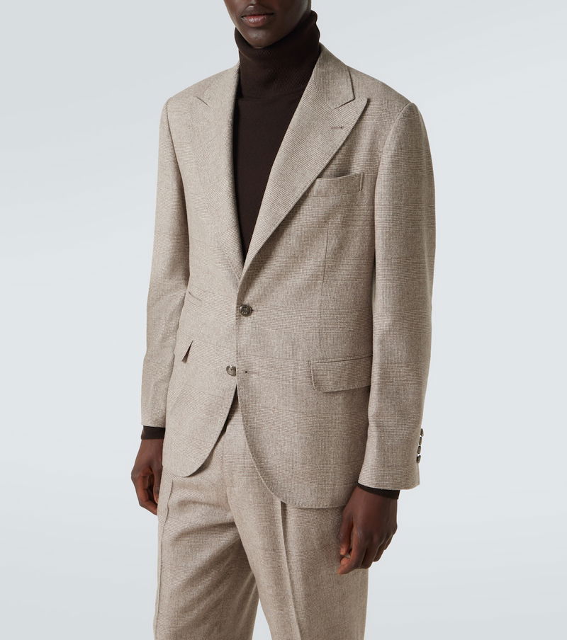 Tailored to perfection, this Brunello Cucinelli suit features a timeless Prince of Wales check motif. Cut from a silk, wool, and cashmere blend, the single-breasted silhouette is finished with sharp peak lapels and double vents.