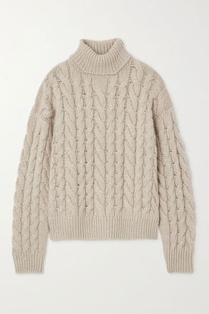 Brunello Cucinelli incorporates tiny sequins into this sweater, giving the classically preppy design an elevated touch. It's cable-knitted with plenty of mohair, cotton and wool and has a loose fit.