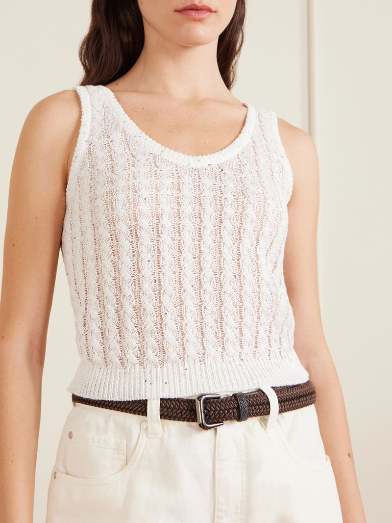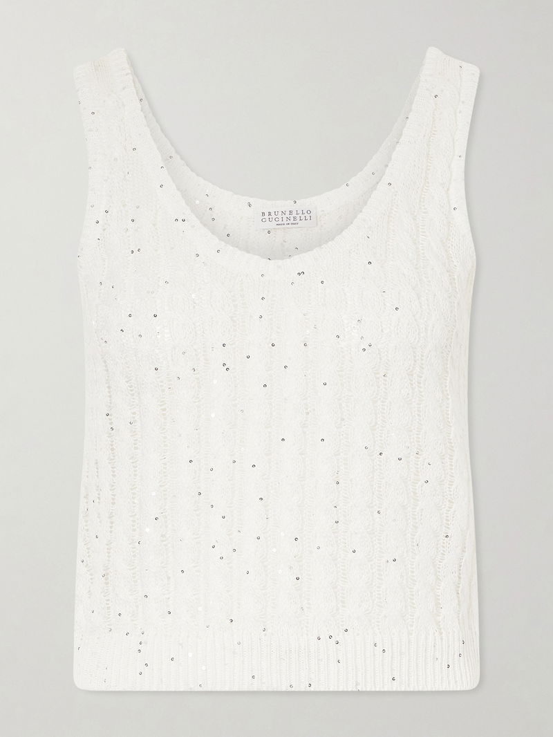 Brunello Cucinelli's airy linen-blend tank top is open-knitted and embellished with sparkling sequins. It can be easily styled with jeans or tailored trousers.