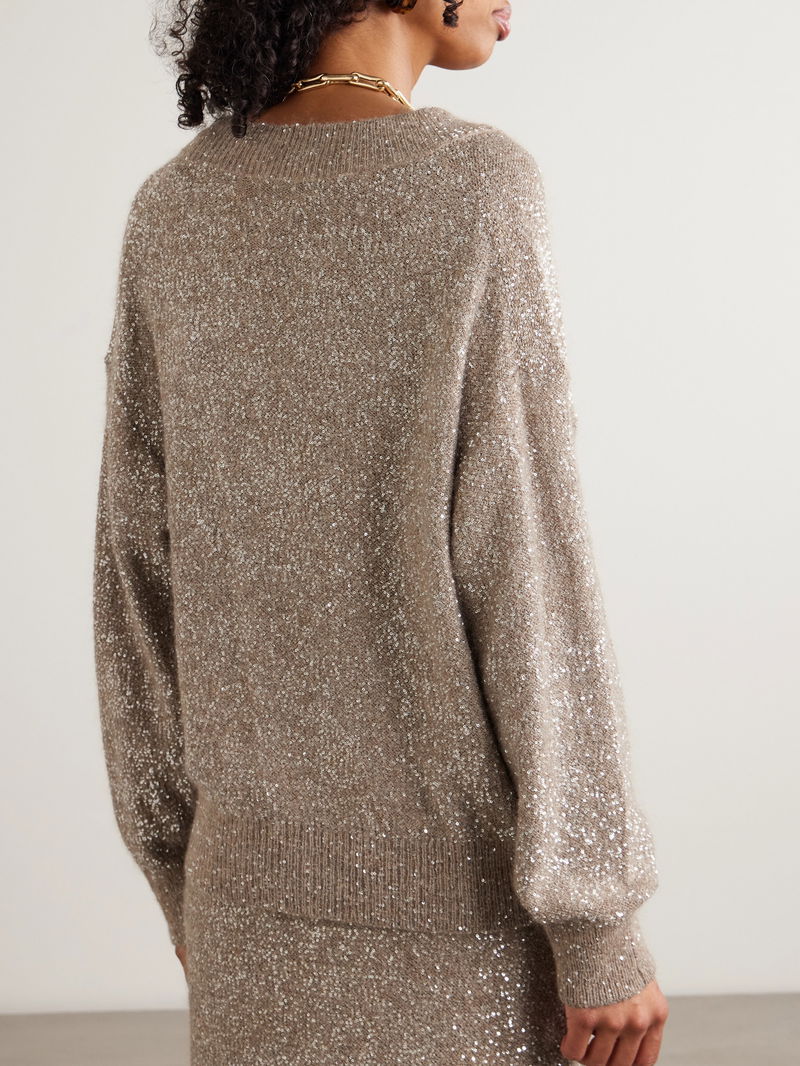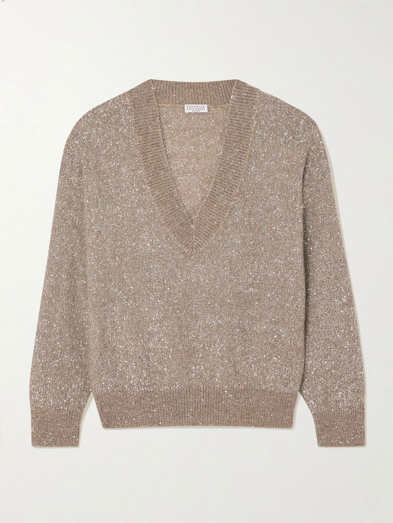 Brunello Cucinelli's sweater has been knitted in Italy with a touch of mohair and adorned with light-catching sequins. It has dropped shoulders and a V-neckline, ideal for framing a statement pendant.