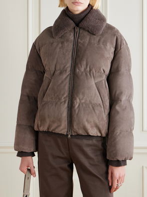 This quilted jacket from Brunello Cucinelli is inspired by traditional British apparel. Made from technical material, the cropped style is padded to ensure warmth and has a shearling-trimmed collar for a cozy feel.
