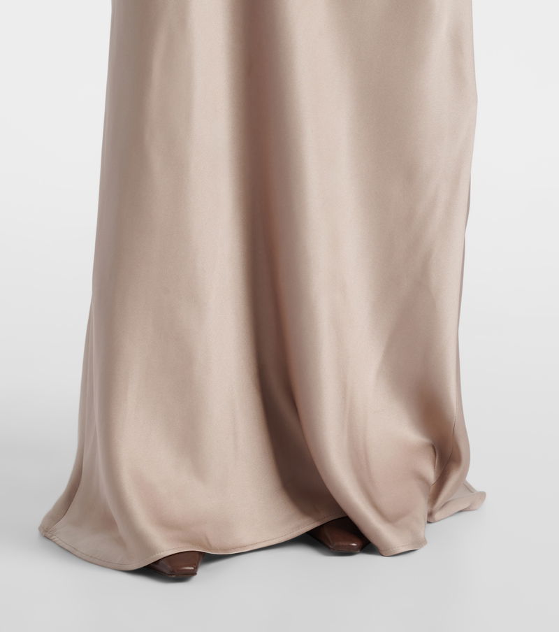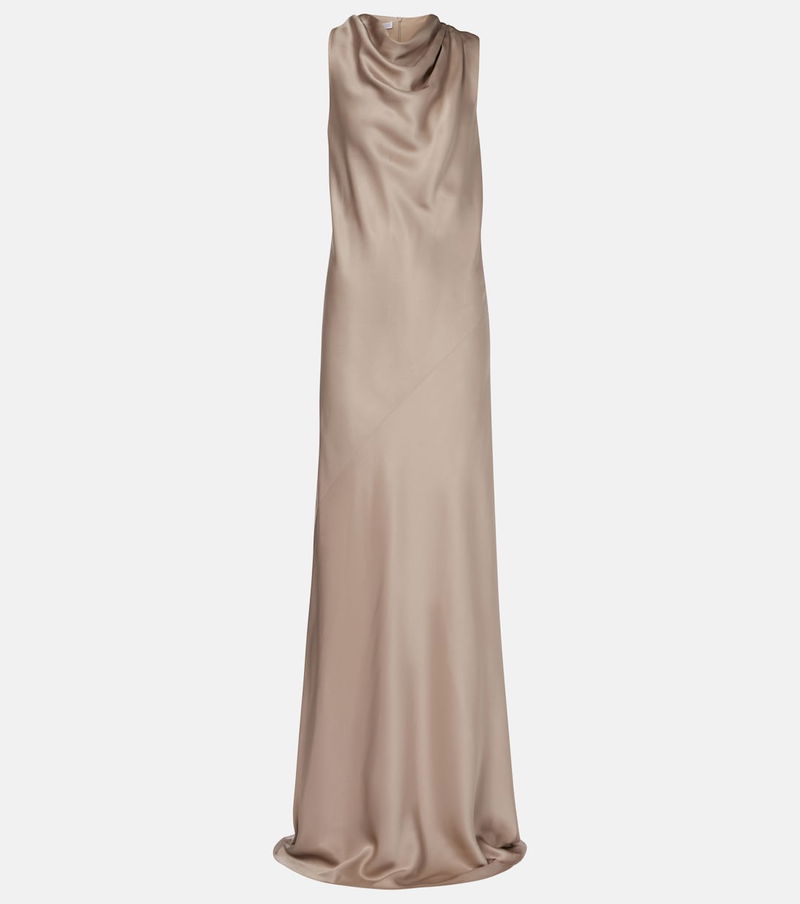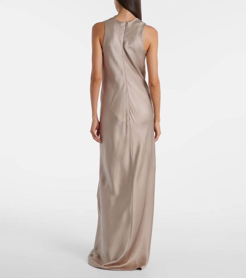 Brunello Cucinelli's designs are created in Solomeo, a medieval hamlet whose art and traditions are woven into the house's every fiber. This elegant gown is crafted from silk and features a shawl neckline with invisible zipper closure.