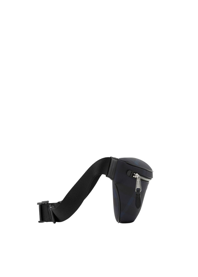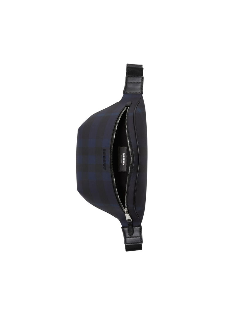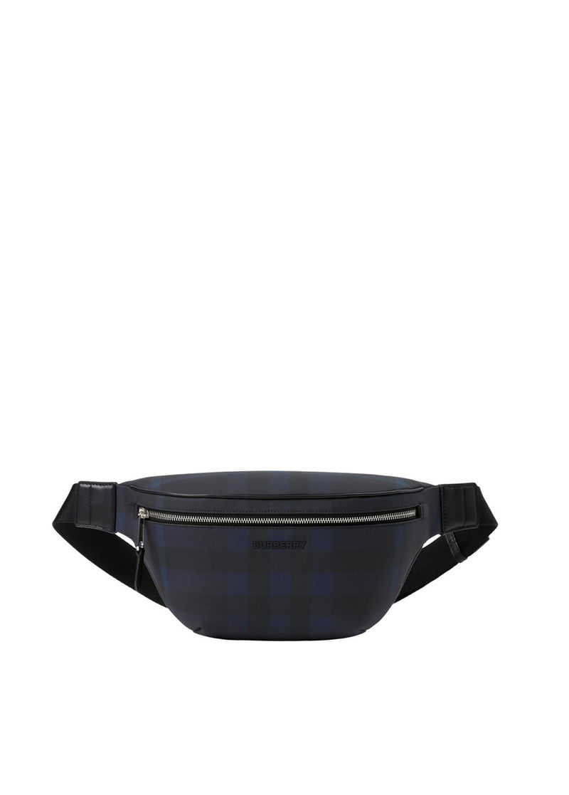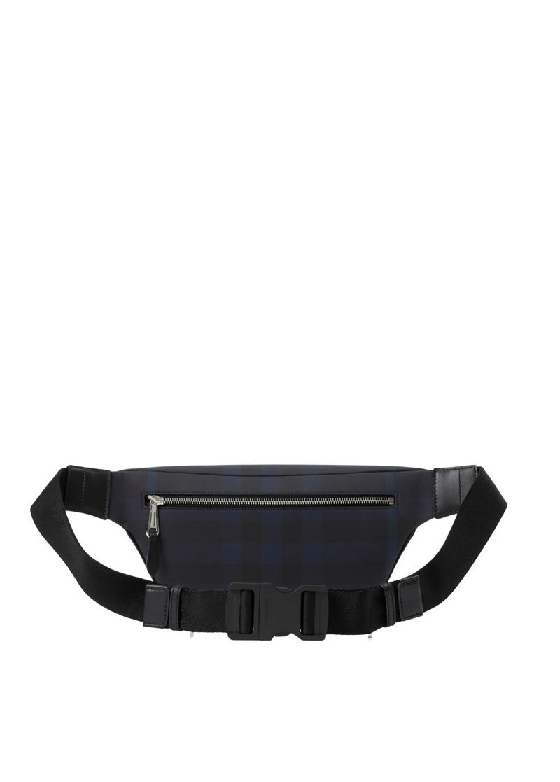 Woven Burberry Check, Adjustable clip belt, Zip closure, One exterior back zip pocket, one interior slip pocket, Hand-painted edges, Polished metal hardware, Raised Burberry lettering at front.