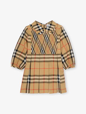 A sleeveless dress made from cotton poplin woven with the Burberry Check. The silhouette is shaped with a smocked bodice and gathered skirt.